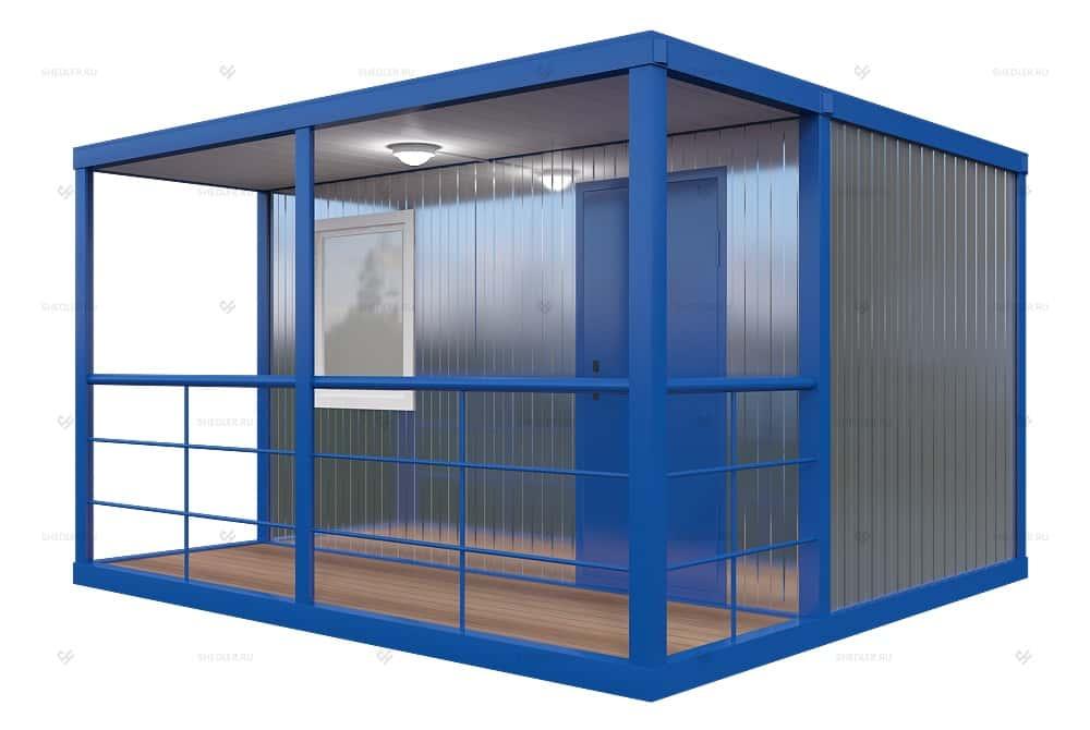 При необходимости клиент может скорректировать материалы отделки и техническое оснащение модуля, эти детали уточняются при согласовании проекта. Доставка блок-контейнера с верандой БКВ-01 4м от SHEDLER выполняется в оговоренный день - конструкцию привезут длинномером собранную и установят на подготовленное место. Специального фундамента не нужно - подойдет любая ровная и прочная поверхность. Такое сооружение в дальнейшем можно будет перевезти и установить на новом месте.