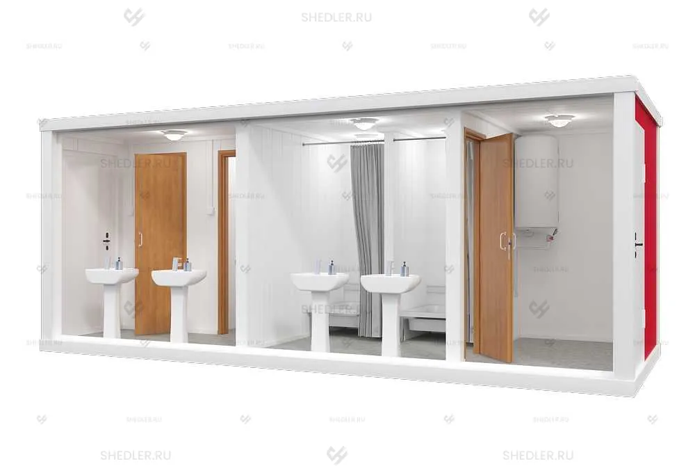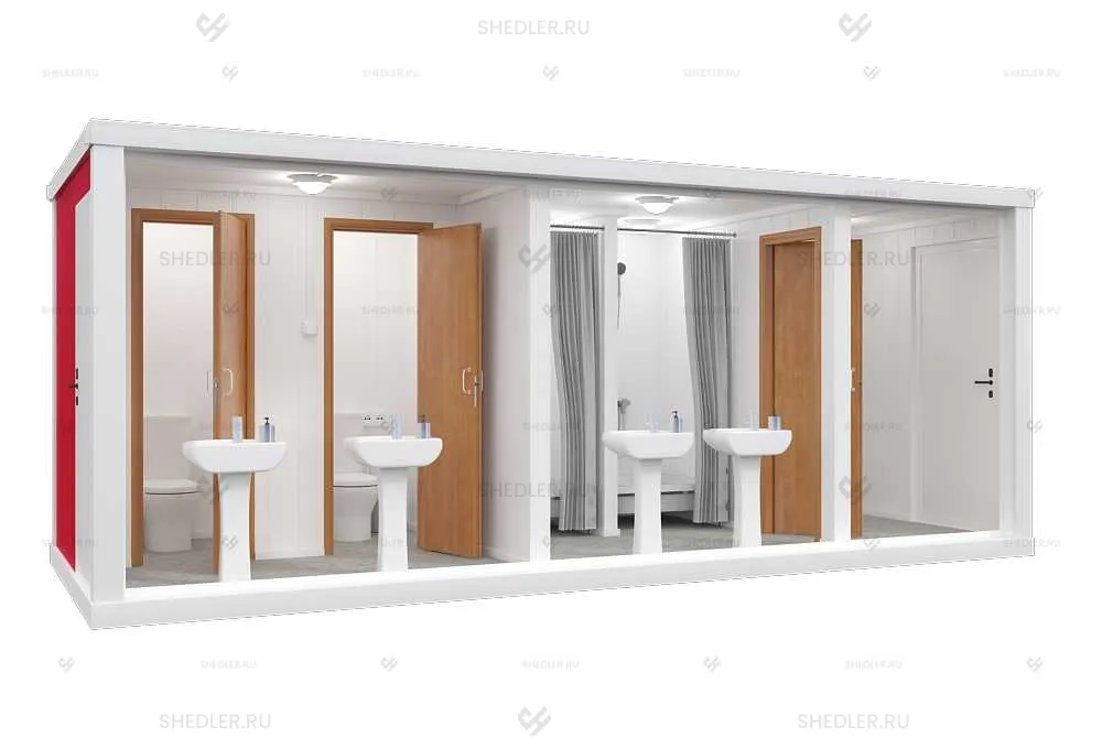 Сантехнический блок-контейнер СБК-08 от Шедлер представляет собой полноценную альтернативу стационарному туалету, модуль используется в удаленных локациях для обеспечения гигиенических условий. Они применяются на массовых мероприятиях, при устранении аварий, а также на стройплощадках и в вахтовых поселках. Преимущество конструкции в том, что ее можно перевозить вместе с объектом, она быстро снимается с места и транспортируется без разборки.