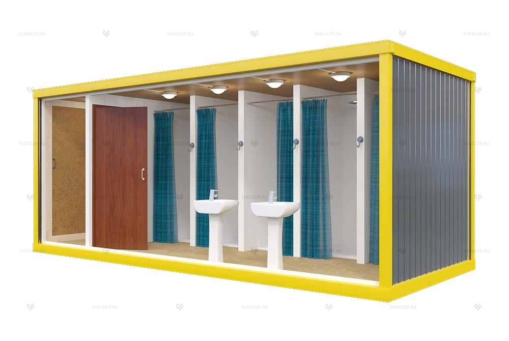 В блок-контейнере СБК-011 SHEDLER 5 душевых поддонов и 2 раковины. Установлены светильники (3 шт.), розетки (4 шт.). При необходимости количество можно увеличить.