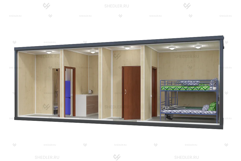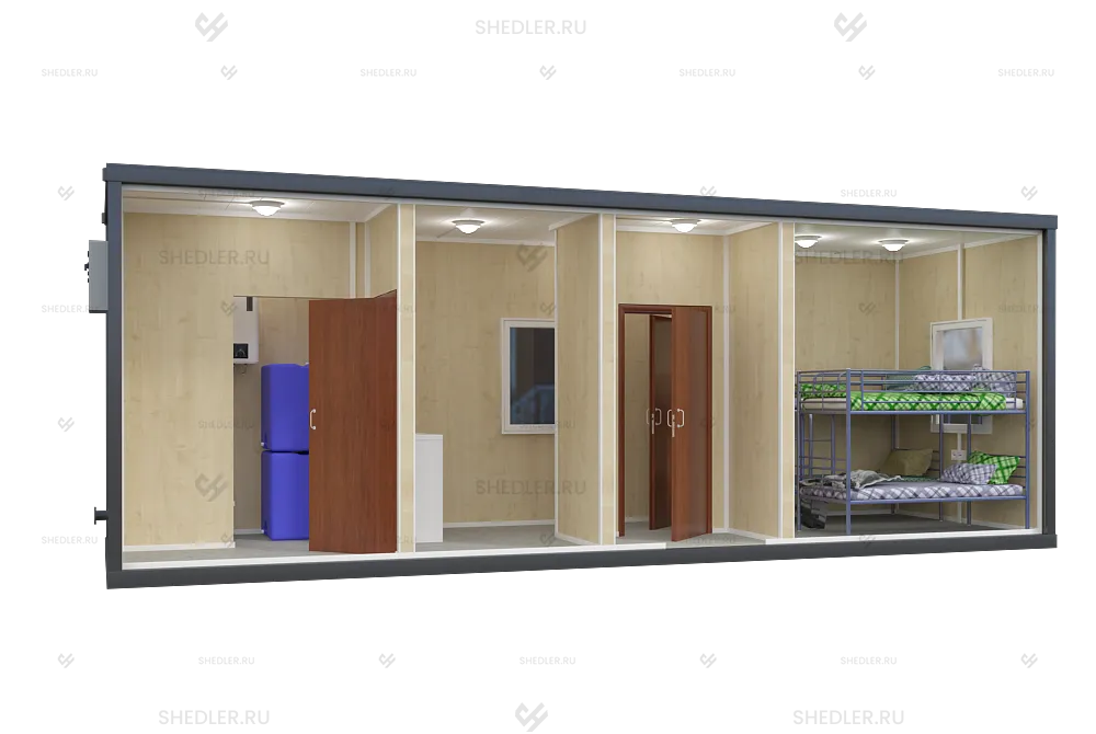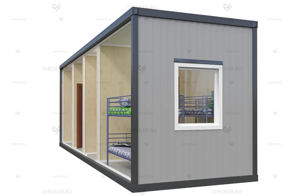 Блок-контейнер БК-031 от Шедлер – это одноэтажный модуль нестандартного размера. Модель может использоваться в качестве офиса, склада или бытовки для персонала на производственных и строительных площадках, а также в вахтовых поселках.