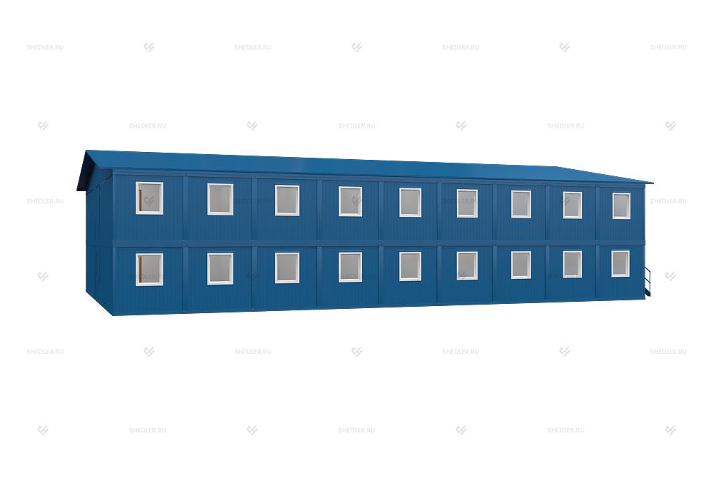 Модульное здание МЗ-50 SHEDLER подходит для работы и временного проживания. В здании два этажа, на которых расположены санузел с 4 раздельными кабинками и душевая с 4 поддонами и 2 раковинами.