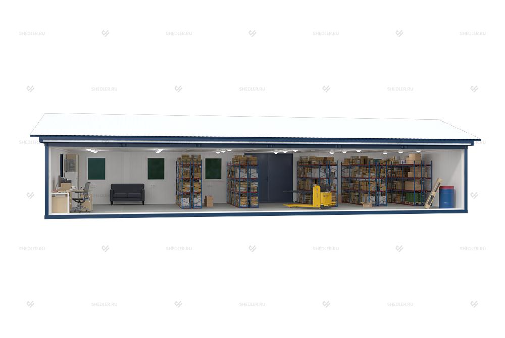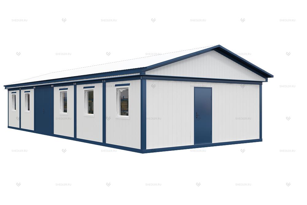 Модульное здание МЗ-61 Шедлер представляет собой одноэтажное здание из 6 блок-контейнеров размером 6,0м х 14,7м х 2,45м может использоваться в качестве административного, производственного или офисного объекта в регионах с различными температурными условиями и количеством осадков.