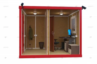 Внутренняя отделка стен выполнена из МФД, для отделки потолка использованы пластиковые панели. На полу уложена шпунтованная доска 26 мм и линолеум. Выполнено утепление стен, пола и потолков материалом 150 мм, что позволяет использовать блок-контейнер даже в самых суровых погодных условиях.