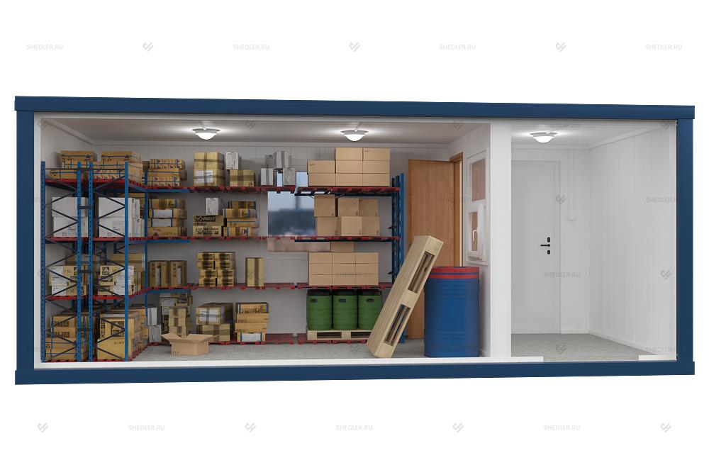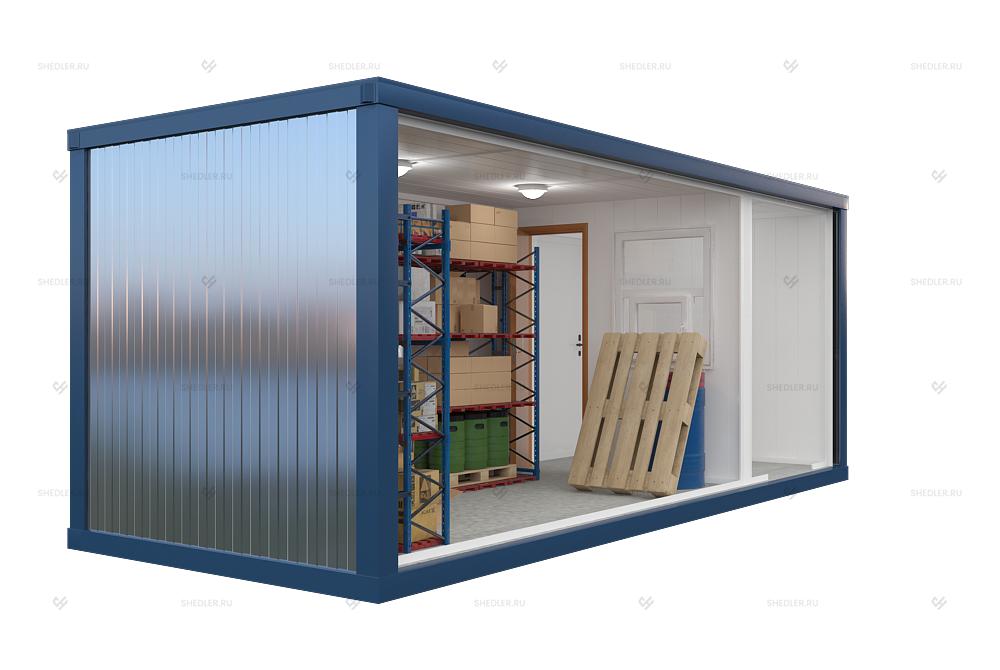 Быстровозводимые складские помещения проще всего организовать при помощи контейнера для склада БК-014 от SHEDLER. Модульная конструкция размером 5,85 х 2,45 х 2,5 м обеспечивает площадь для хранения материальных ценностей в 14,33 кв.м.