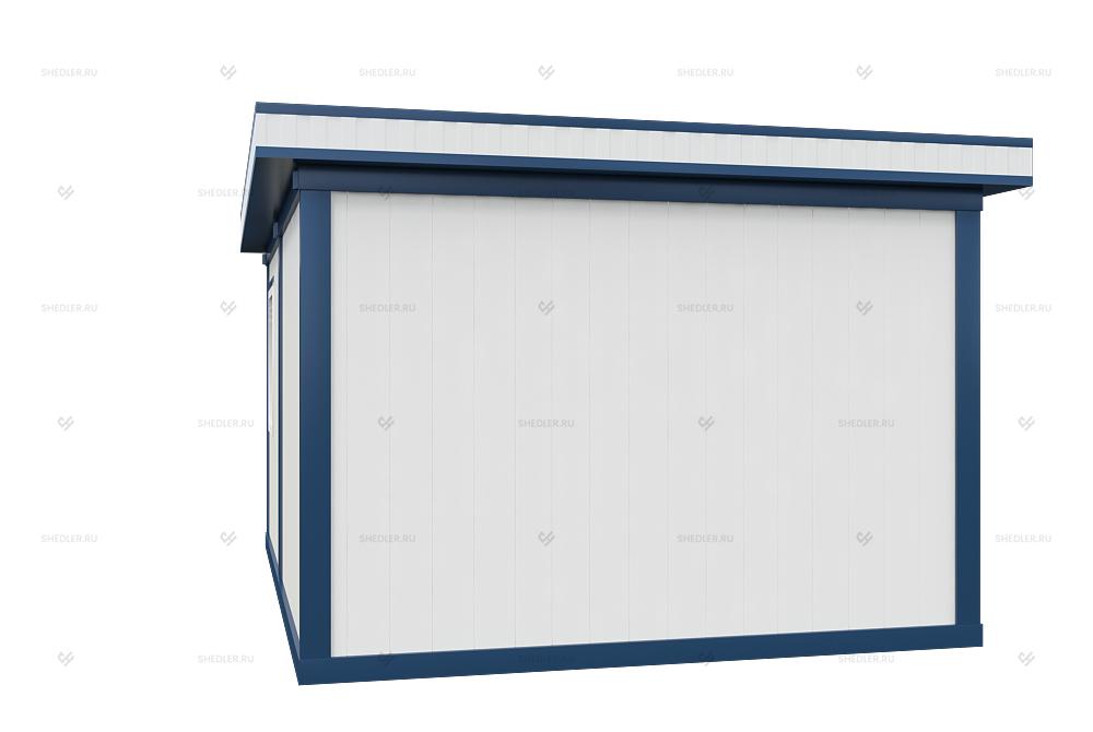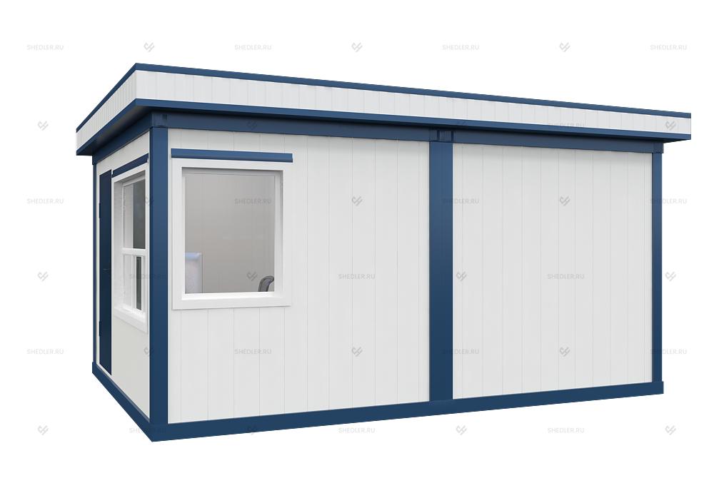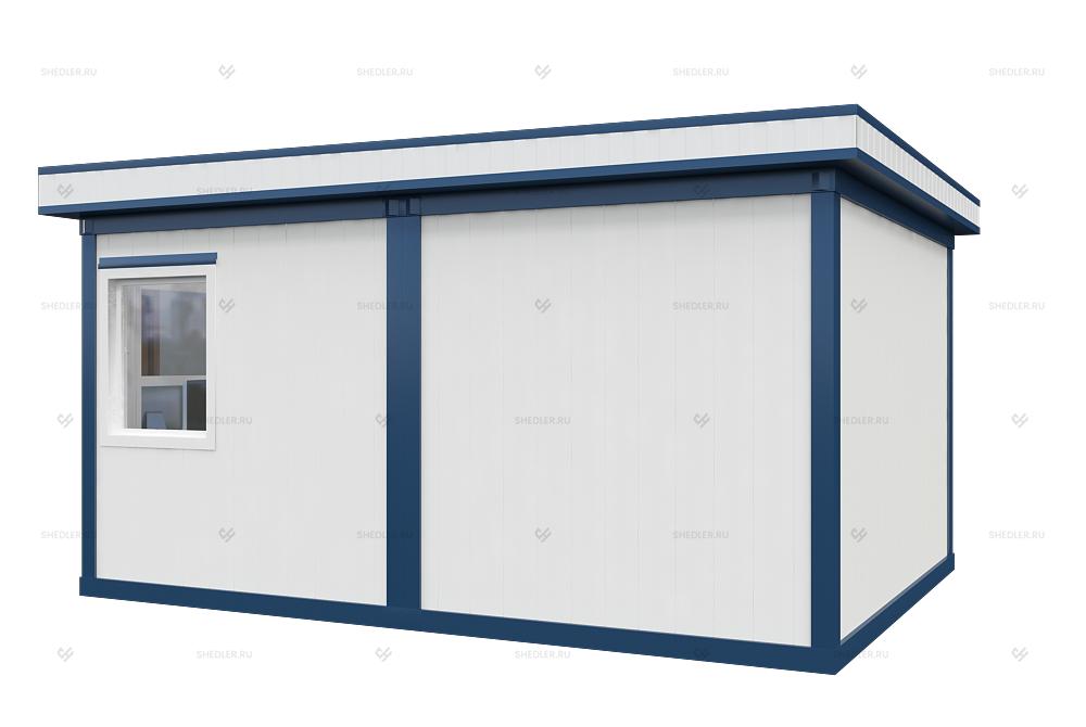 Для обеспечения уникальных качеств используется несущая основа – каркас, сваренный из холоднокатаного швеллера 125 мм и уголка 140 х 100 мм с порошковым покрытием синего цвета. Сверху на каркас установлена плоская крыша из листовой стали 0,7 мм, а снизу – дно из оцинкованного профлиста C8. Экстерьер формируют сэндвич-панели Rockwool 100 мм с полимерным покрытием цвета RAL 5005.