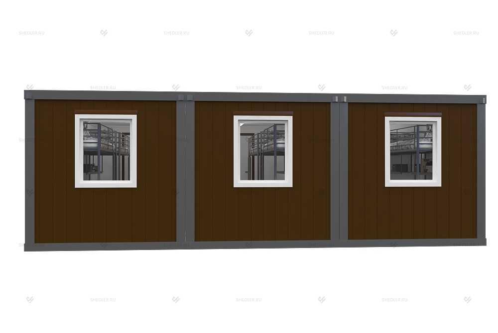 Особенность блок-модуля состоит в том, что каждый контейнер представляет собой самостоятельное помещение – с собственной входной дверью российского производства из стали и ПВХ-окном размером 1,0 x 0,8 м с поворотно-откидным механизмом открывания. Такая конструкция позволяет применять постройку в качестве склада или мастерской.