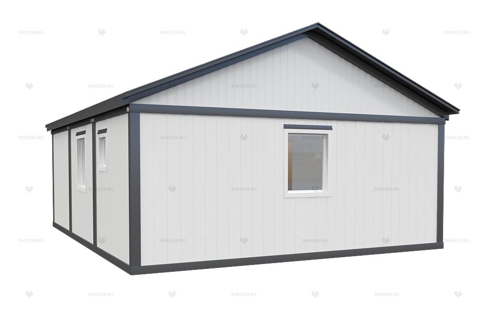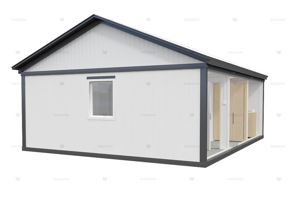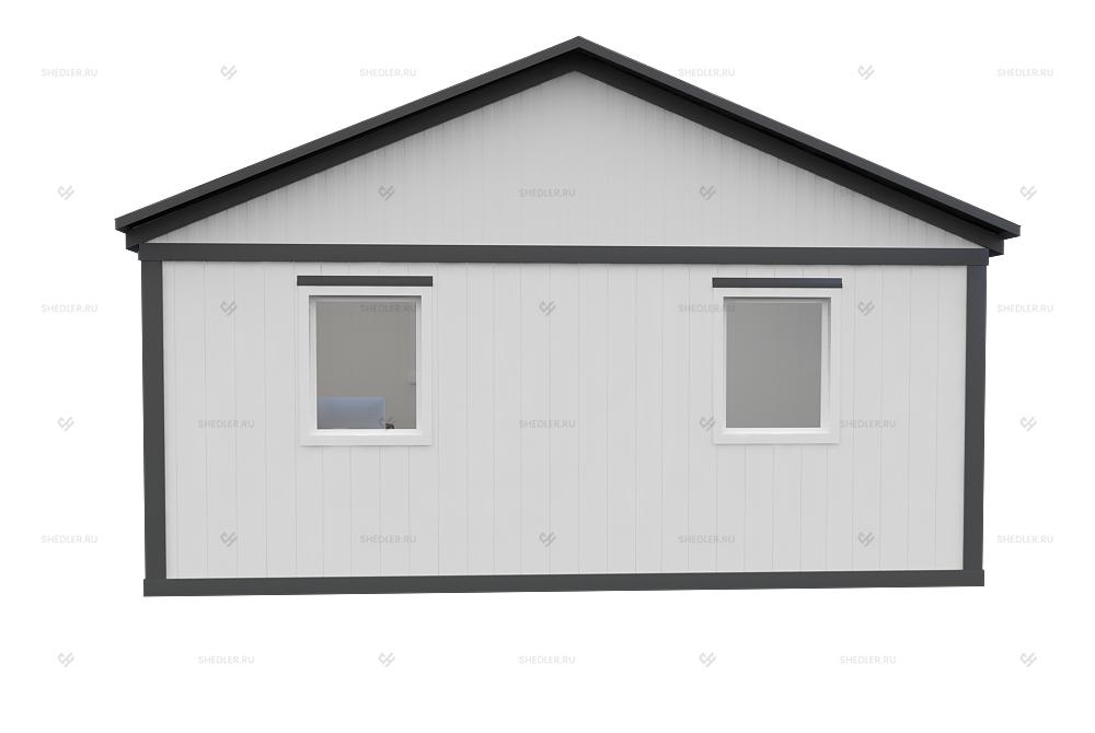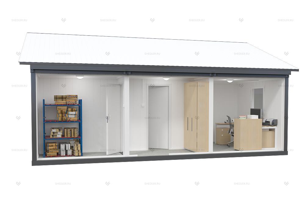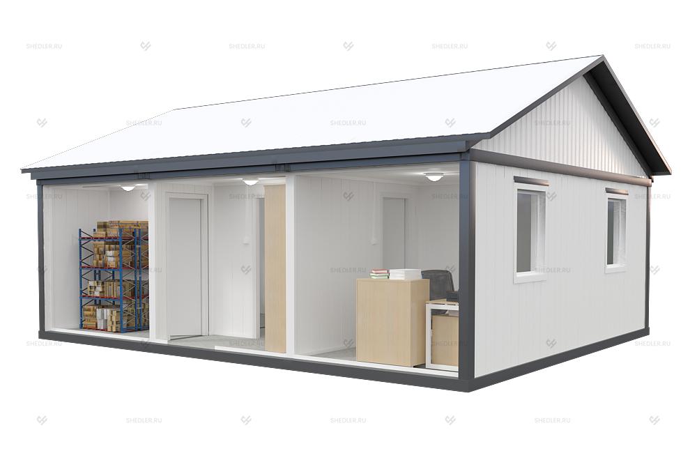 Быстровозводимый объект из 3 блок-контейнеров с двускатной кровлей отлично подходит для любых нужд. Архитектура и размеры сооружения позволяют использовать его в качестве дачного домика или мобильного офиса, который функционально ничем не уступает капитальному объекту. Наличие санузла с душем обеспечивают городской уровень комфорта, а качественного утепления – высокую энергоэффективность. Модульное здание БМ-32 SHEDLER значительно дешевле по сравнению с возведением капитального сооружения.