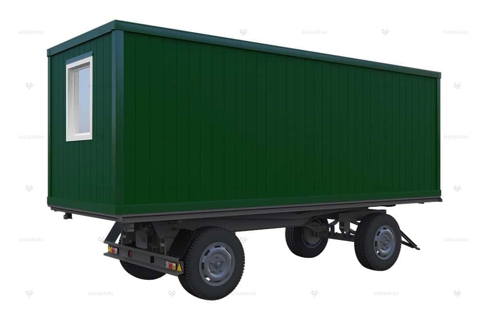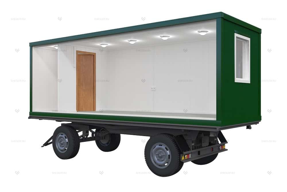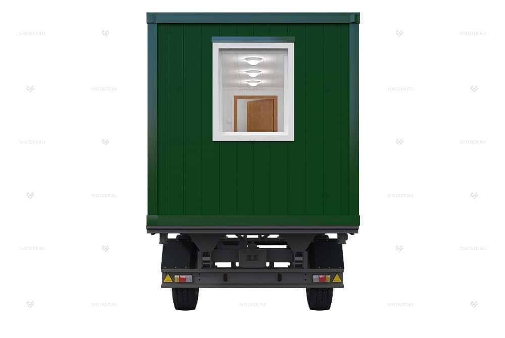 Модификация с 2 однокамерными ПВХ-окнами размером 0,8 x 1,0 м и поворотно-откидным механизмом построен на базе прицепа-шасси 8800 х 2440 х 1225 мм. Контейнер на шасси из сэндвич-панелей КБК-03 СП от SHEDLER привозят на участок уже в собранном виде - конструкция полностью готова к использованию, достаточно только подключить коммуникации.