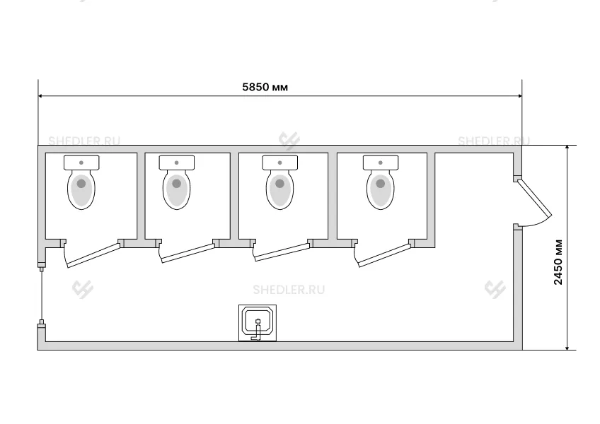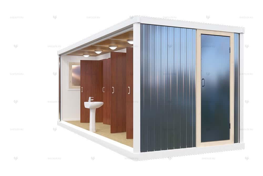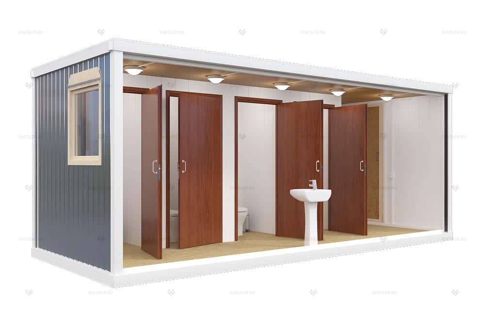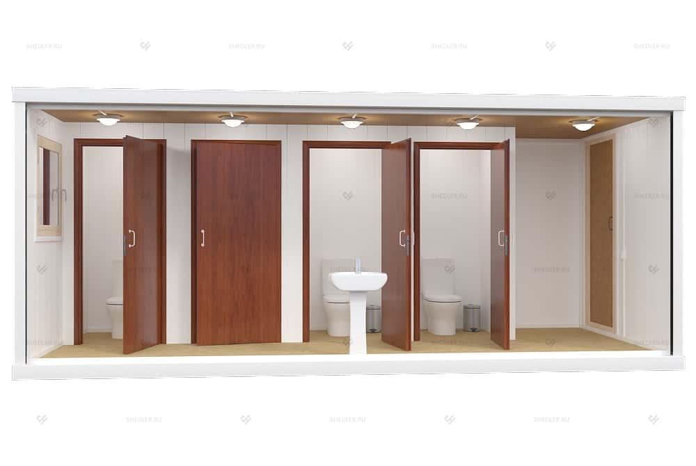 Блок контейнер СБК-04 оборудован одним умывальником и четырьмя унитазами для удобства пользователей. Также блок оснащен одним входным дверью и четырьмя межкомнатными дверями из МДФ для обеспечения конфиденциальности.