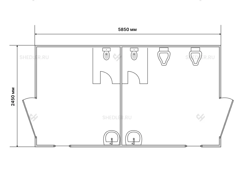 Блок СБК-03 оснащен двумя входными дверьми, двумя окнами, электропроводкой, писсуарами, унитазами, раковинами и другими необходимыми элементами. В комплекте также имеется наличие дополнительных перегородок с дверьми для комфорта и конфиденциальности.