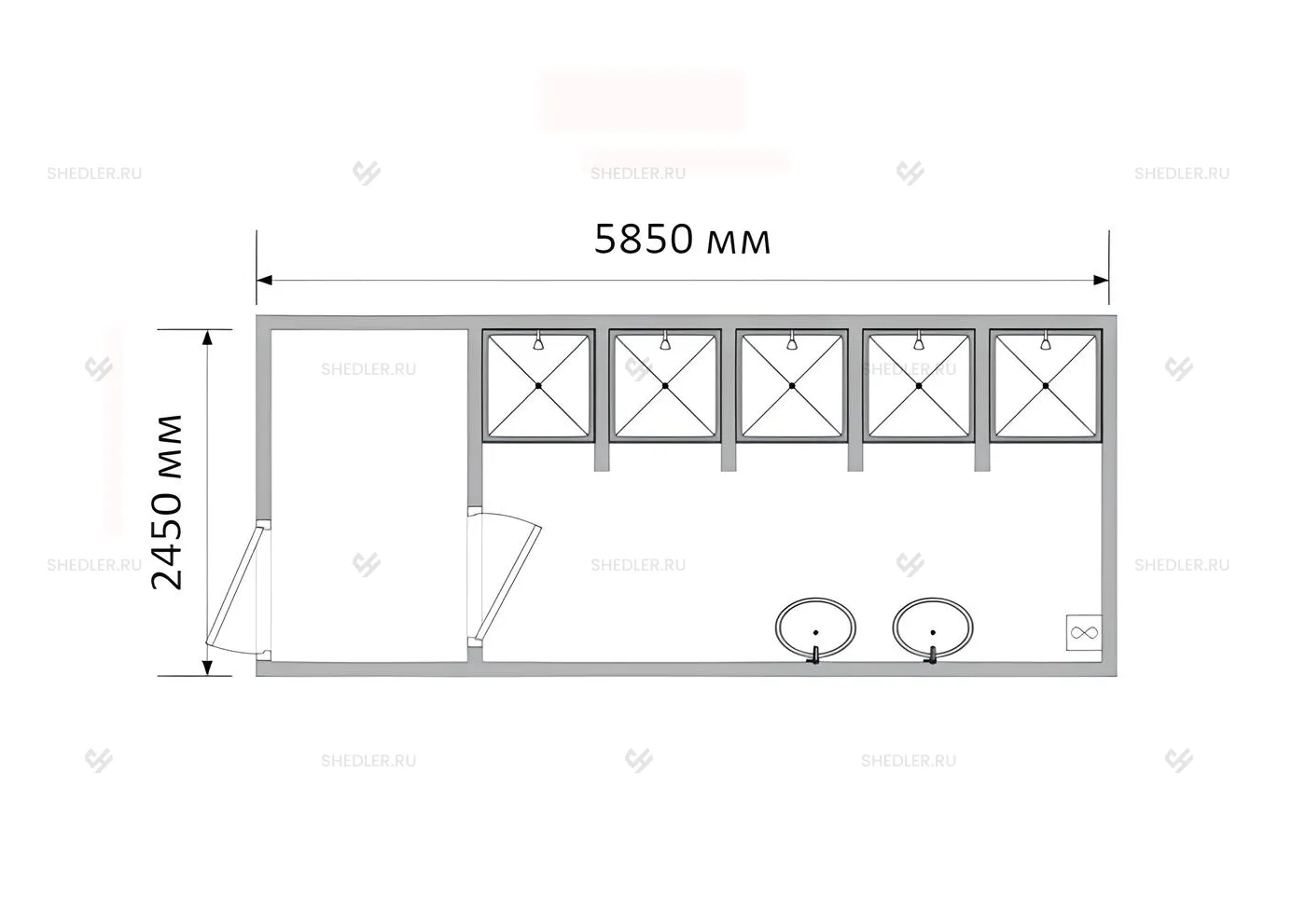 В блок-контейнере СБК-011 SHEDLER 5 душевых поддонов и 2 раковины. Установлены светильники (3 шт.), розетки (4 шт.). При необходимости количество можно увеличить.