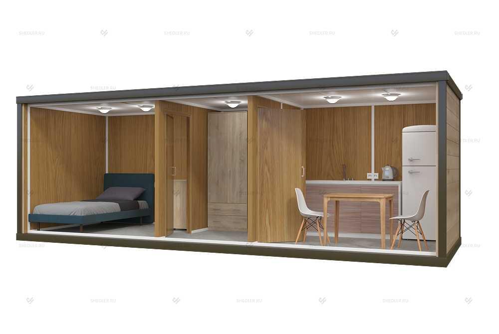 Блок-контейнер БК-061 Шедлер – это полноценное здание быстровозводимого типа, используется для временного проживания, хранения имущества, востребован в широкой среде. Сооружения применяют в частном порядке в виде жилого модуля, в коммерческих целях в качестве офиса, прорабской, раздевалки и т.д.