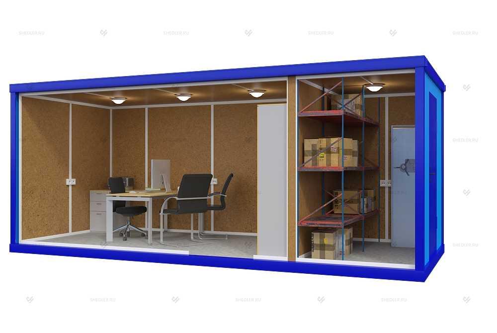 Внутреннее пространство модуля разделено на 2 помещения – кладовку и комнату. Изолированный доступ в них обеспечивают 2 металлических входных двери российского производства. Каждая оборудована врезным замком, механизм гарантирует взломостойкость каждого помещения, защиту от несанкционированного проникновения.