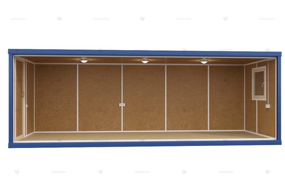 Поверхность пола формирует ДСП 16 мм, внутренние стены облицовываются ДВП. Отделка интерьера позволяет использовать блок-контейнер сразу после установки. Этому способствует и электропроводка в кабель-канале мощностью 2,5 кВт, благодаря которой покупатели могут использовать энергоемкое оборудование. Для защиты электропроводки от возгораний из-за перегрузок установлен автоматический выключатель на 16 А.