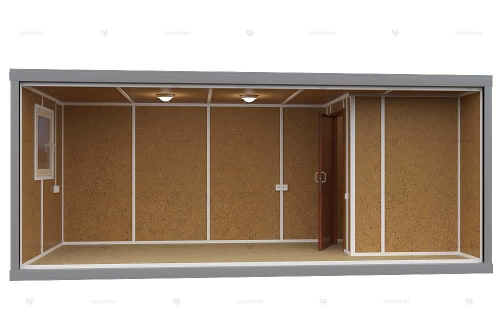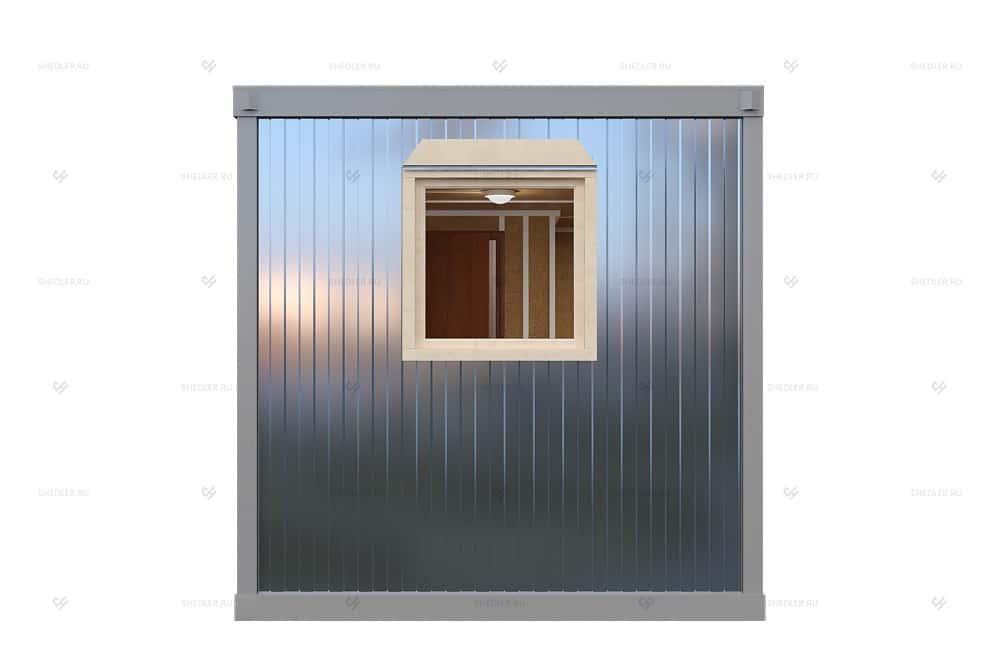Для естественного освещения и вентиляции в комнате предусмотрено однокамерное, одностворчатое окно размером 0,9 х 0,9 м. Комфортная обстановка внутри блок-контейнера обеспечивается за счет утепления стен, пола и потолка базальтовой ватой «URSA» 50 мм и облицовки интерьера ДВП.