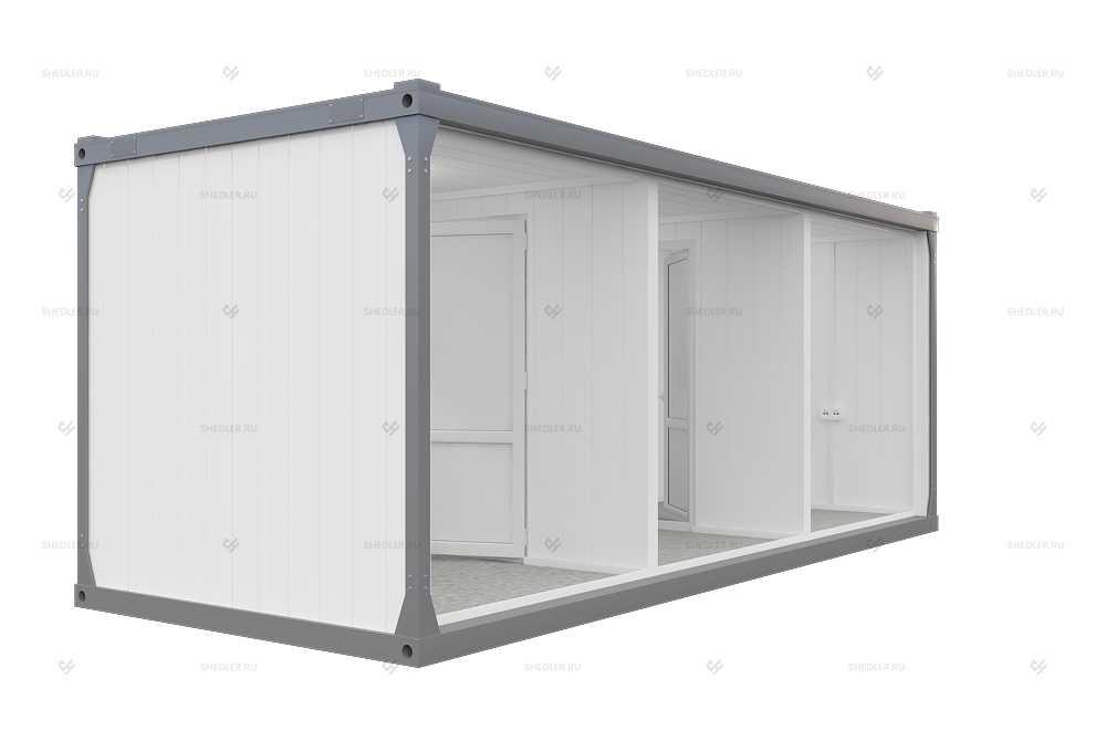 За счет дополнительной комплектации материалы и техническое оснащение модуля могут быть скорректированы. Доставка блок-контейнеров от SHEDLER выполняется только в собранном виде, посредством длинномерного транспорта, но в дальнейшем сооружение можно будет разобрать и перевезти на новое место как частично, так и в готовом виде.