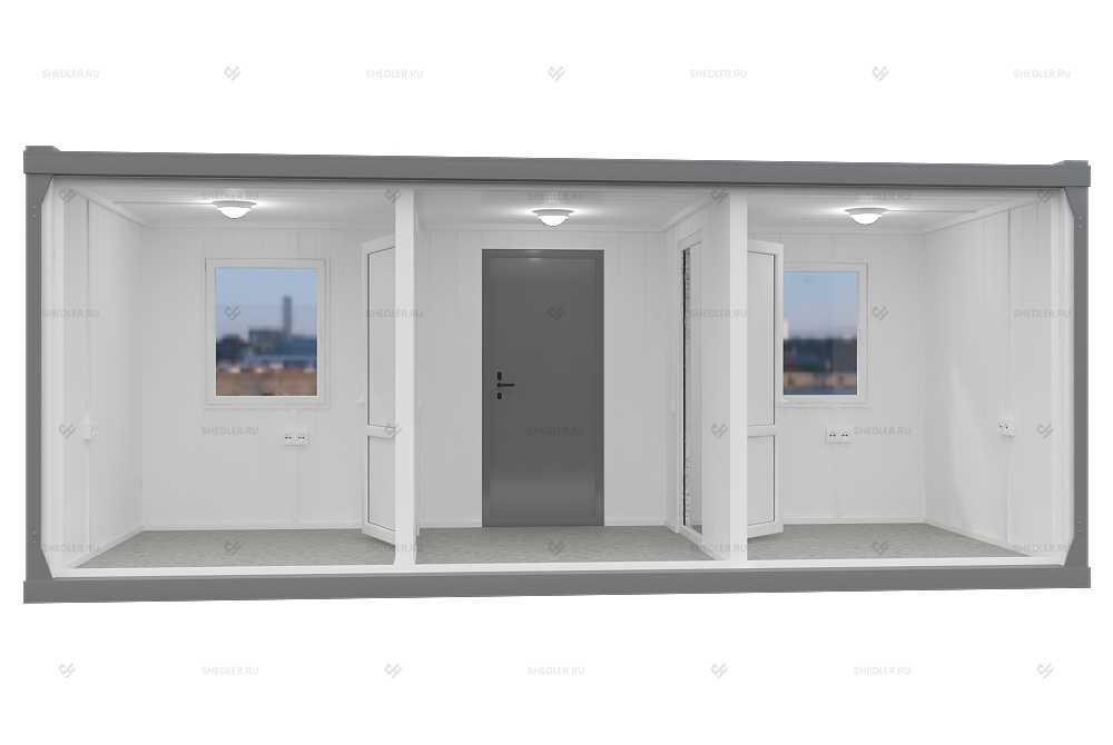 Общее пространство зонируется при помощи внутренних дверей и легких перегородок из трехслойных сэндвич-панелей толщиной 50 мм. Сборно-разборный блок-контейнер БК 04 ПВХ от SHEDLER можно адаптировать для любых целей, он подойдет для коммерции и частных нужд.