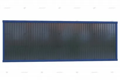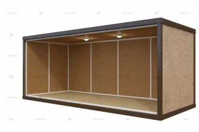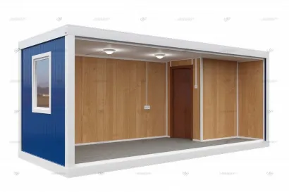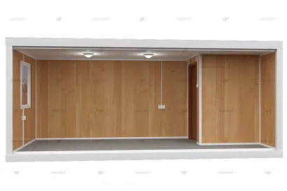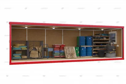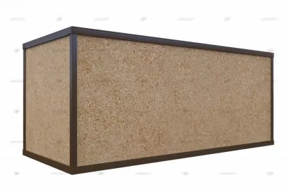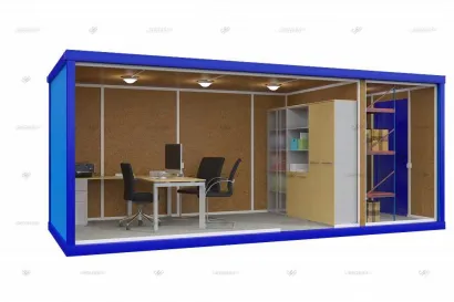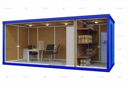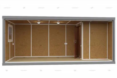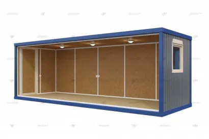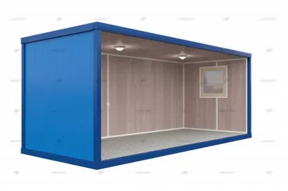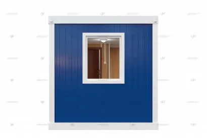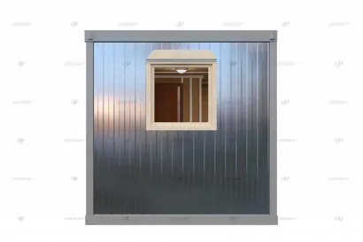 Внутри каркас утеплён специальными материалами и обшит листами ДВП или сэндвич-панелями. Пол изготовлен из OSB-листов. Любая модификация строительного блок-контейнера может быть укомплектована одним из двух вариантов окон: деревянные с двойным остеклением или поворотно-откидные ПВХ. Плоская крыша выполнена из листовой стали.
