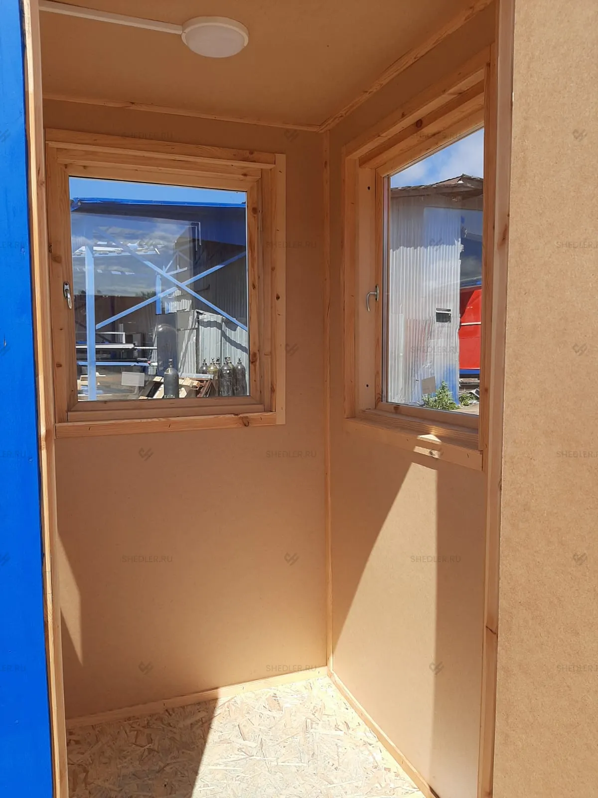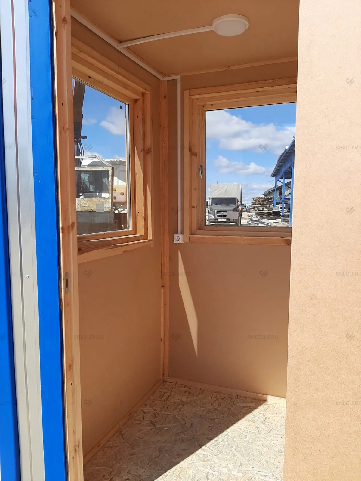 В проекте используются износостойкие и экологичные материалы: основу пола составляет ДСП 16 мм, на нее уложен бытовой линолеум. Стены облицованы ДВП. Компания SHEDLER может предложить и другие варианты отделки, все зависит от области применения поста охраны. Также возможно дооснащение помещения всем необходимым.