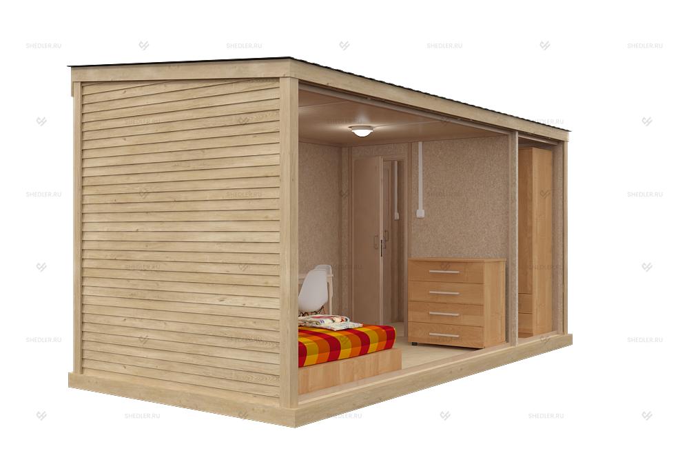 Строительная бытовка с внешней деревянной отделкой Б-01 SHEDLER обладает рядом отличительных качеств: