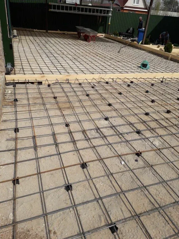 Плитный фундамент — надежное основание для модульных и быстровозводимых строений. Особенно актуален на неустойчивом грунте, где возможны вспучивания или просадки. Используем дорожные плиты размером 1,75 × 3 м.