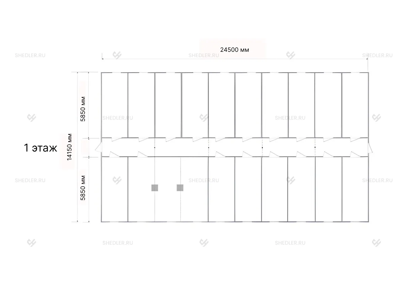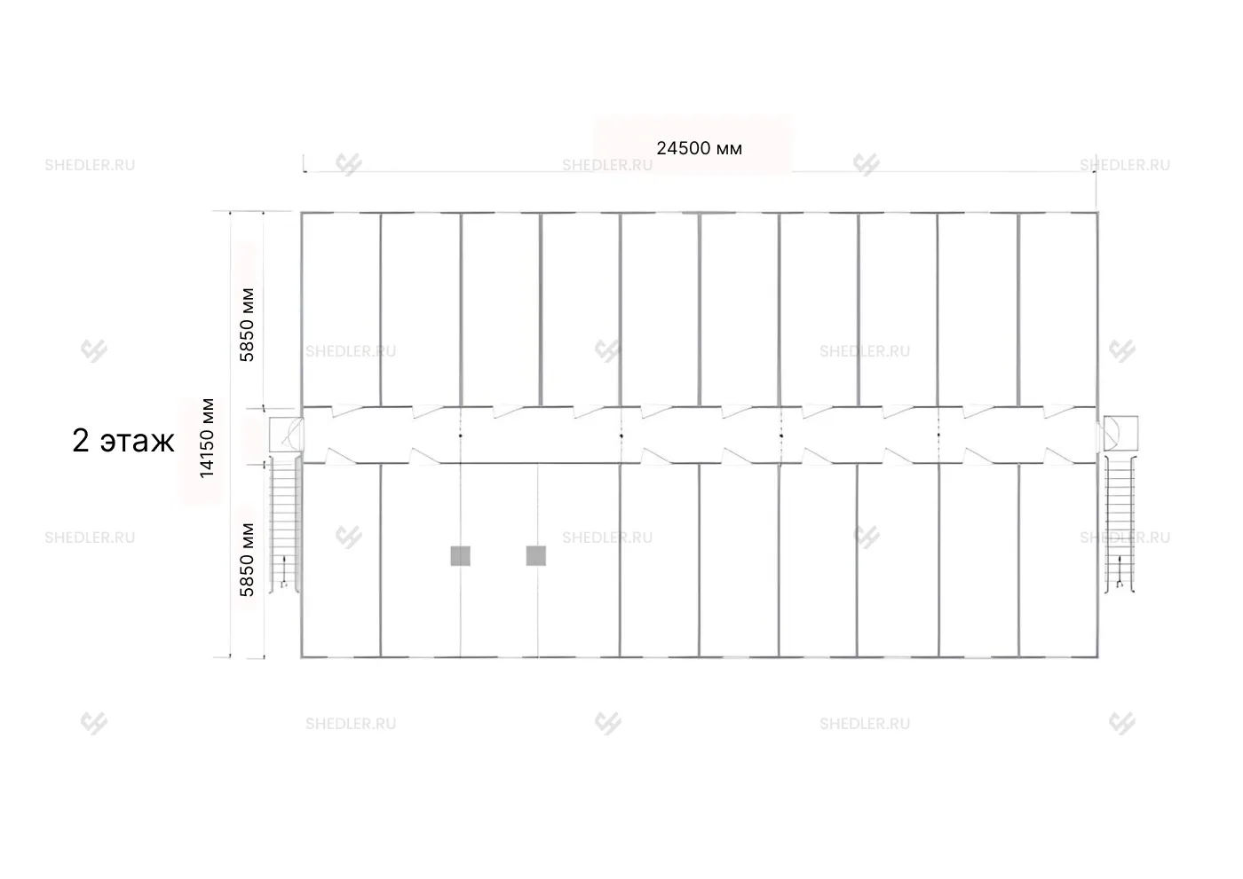 Двухэтажное модульное здание МЗ-01 SHEDLER состоит из 50 блок-контейнеров. Габаритные размеры здания: 24,5 х 14,15 м. Площадь каждого этажа 346,6 м. На каждом этаже расположены по девятнадцать комнат. Подходит под офисные, торговые, санитарно-бытовые и складские помещения.