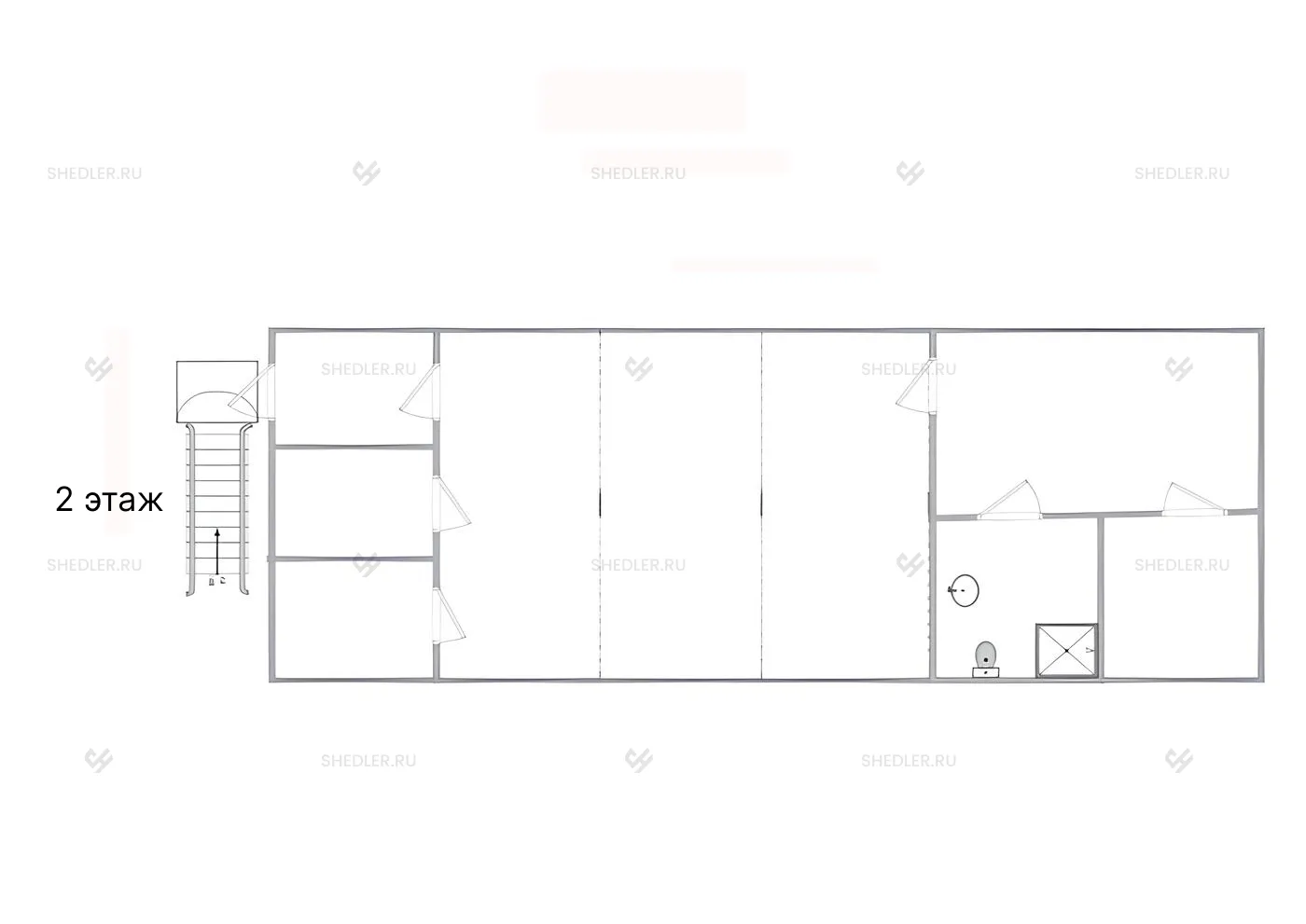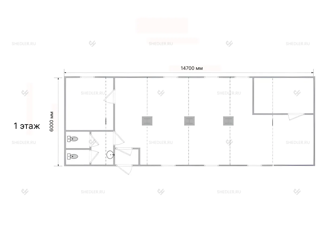 В модульном здании SHEDLER есть два санузла с раковинами, унитазами и 1 душевой поддон. Здание разделено на несколько комнат, которые можно использовать для проживания, в качестве офисного помещения или переговорной.