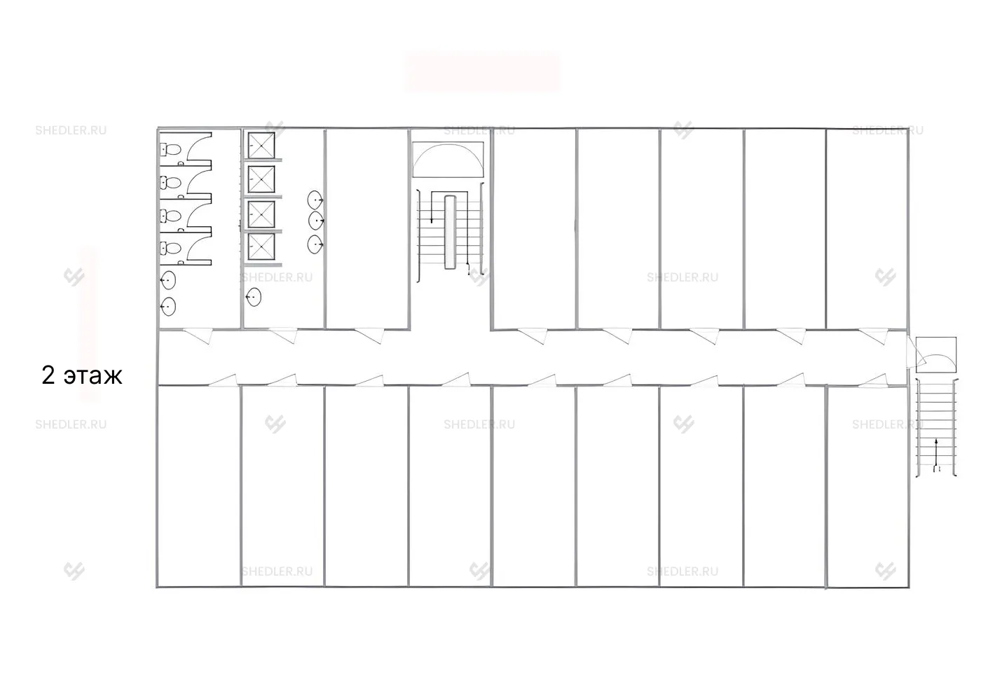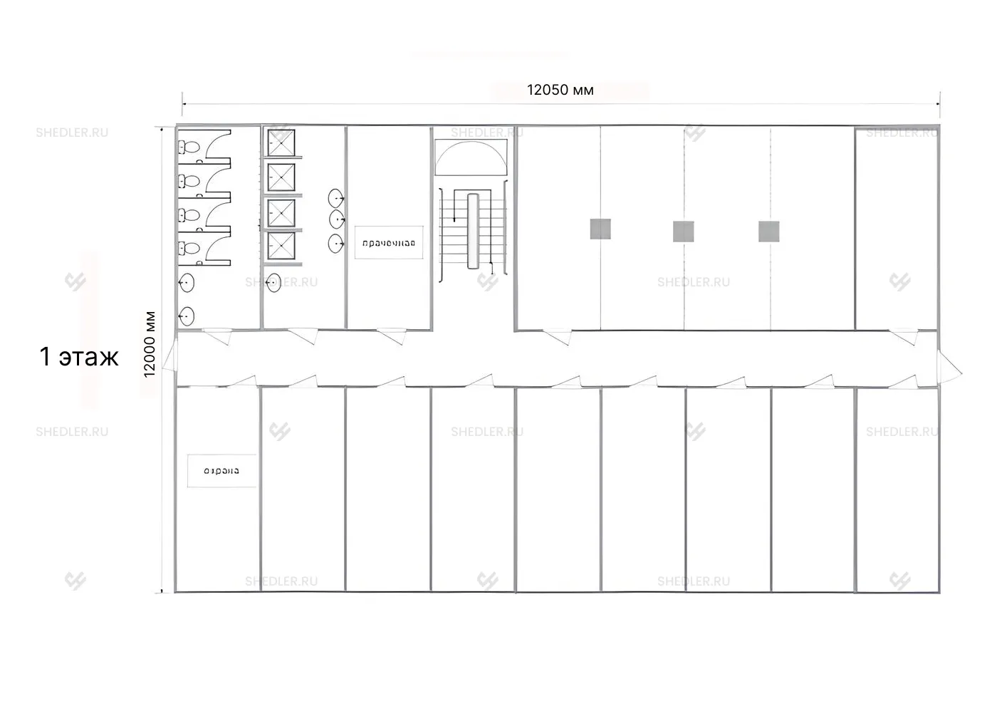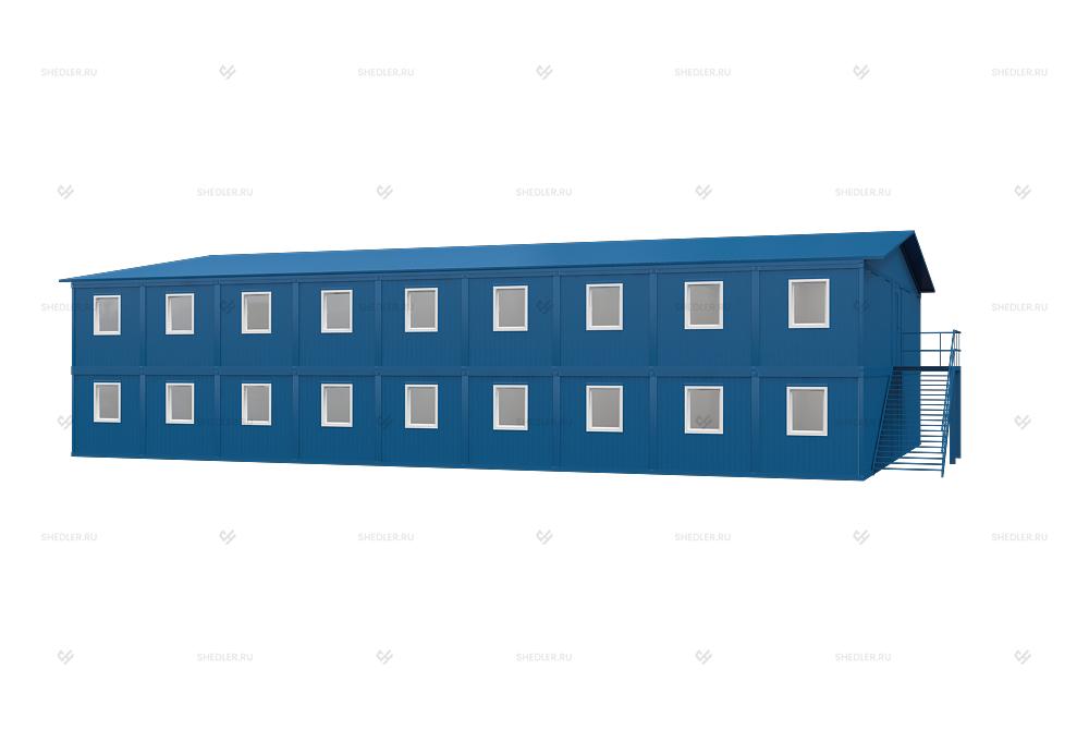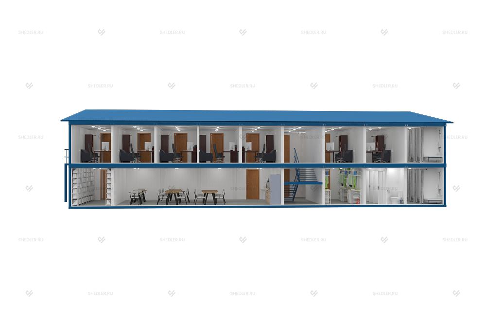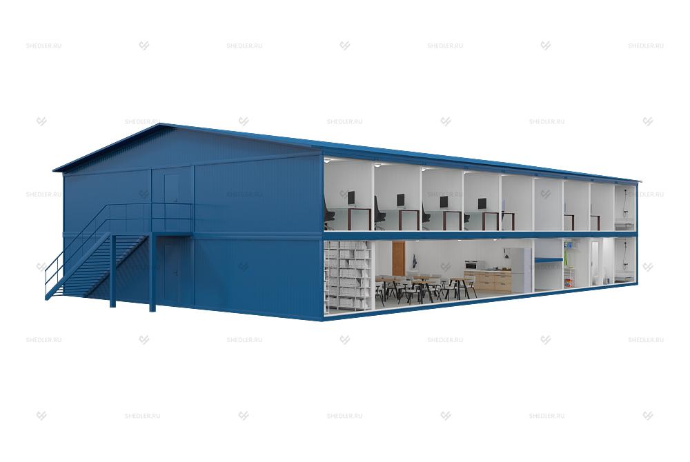 Модульное здание МЗ-50 SHEDLER подходит для работы и временного проживания. В здании два этажа, на которых расположены санузел с 4 раздельными кабинками и душевая с 4 поддонами и 2 раковинами.
