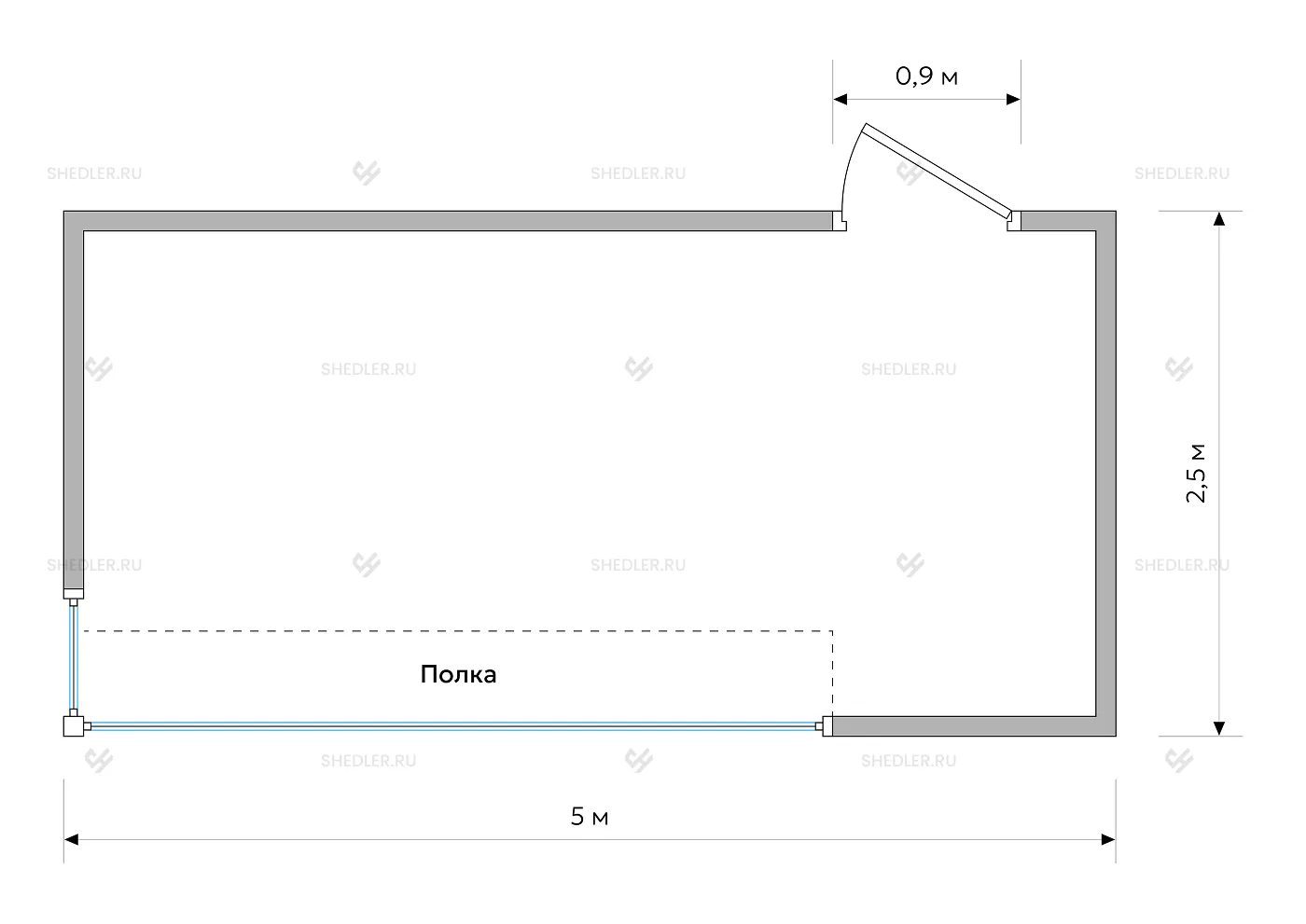 Проект отличается более комфортными условиями для бизнеса, что проявляется в просторном интерьере, где можно эффектно представить товар и удобно обслужить покупателя. При габаритах 5,0 x 2,5 х 2,7 м общая площадь торгового помещения составляет 12,5 кв.м. На ней предусмотрена зона для выкладки товара на стеллажах – продуктов, полиграфии, промтоваров.