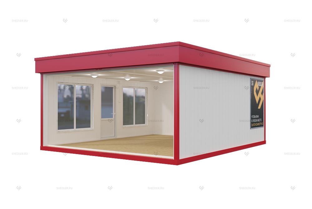 Двускатная кровля состоит из мауэрлата, стропил, конька, стоек, опор и других элементов. Стропильная система может быть двух видов – висячей и наслонной. В качестве кровельного материала может выступать профлист С8, который крепится специальным крепежом к обрешётке. Угол наклона может быть 10 или 12 градусов, в зависимости от ширины конструкции. Используется для модульных зданий различного назначения: офис, штаб строительства, общежитие и т.д.
