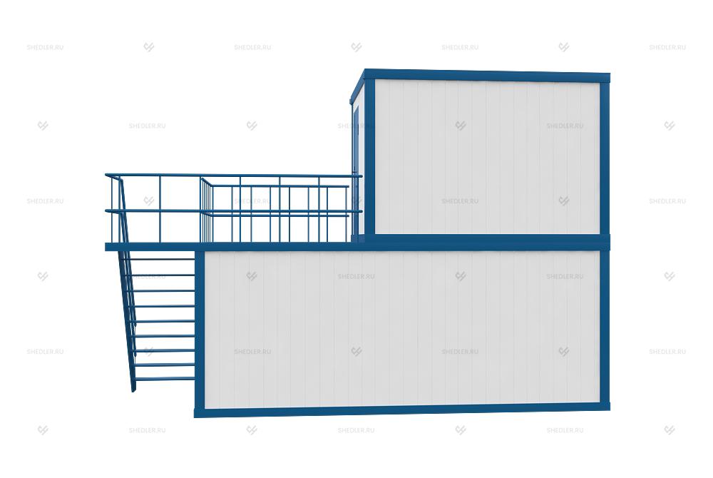 При размере 6,0 x 2,45 х 2,45 м и площади 14,7 кв.м в помещении достаточно пространства для людей и оборудования. Для перемещения между этажами предусмотрена наружная лестница с площадкой 1,25 x 1,25 м и перилами по периметру. В конструкции предусмотрены 3 окна, в том числе с форточкой для проверки документов и входная утепленная дверь российского производства.