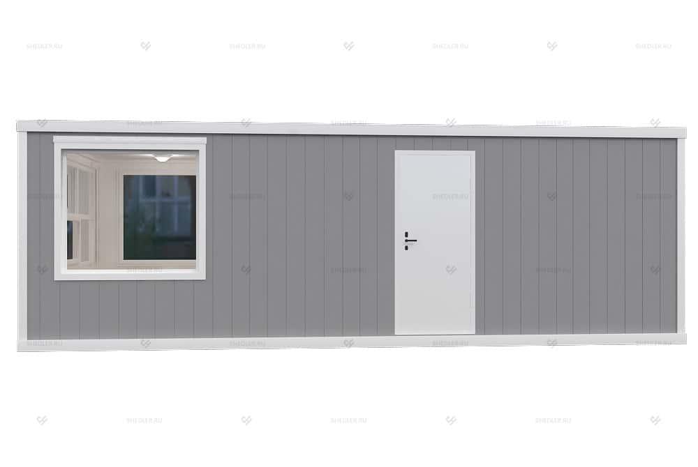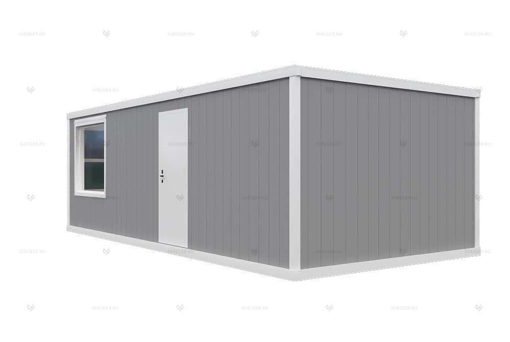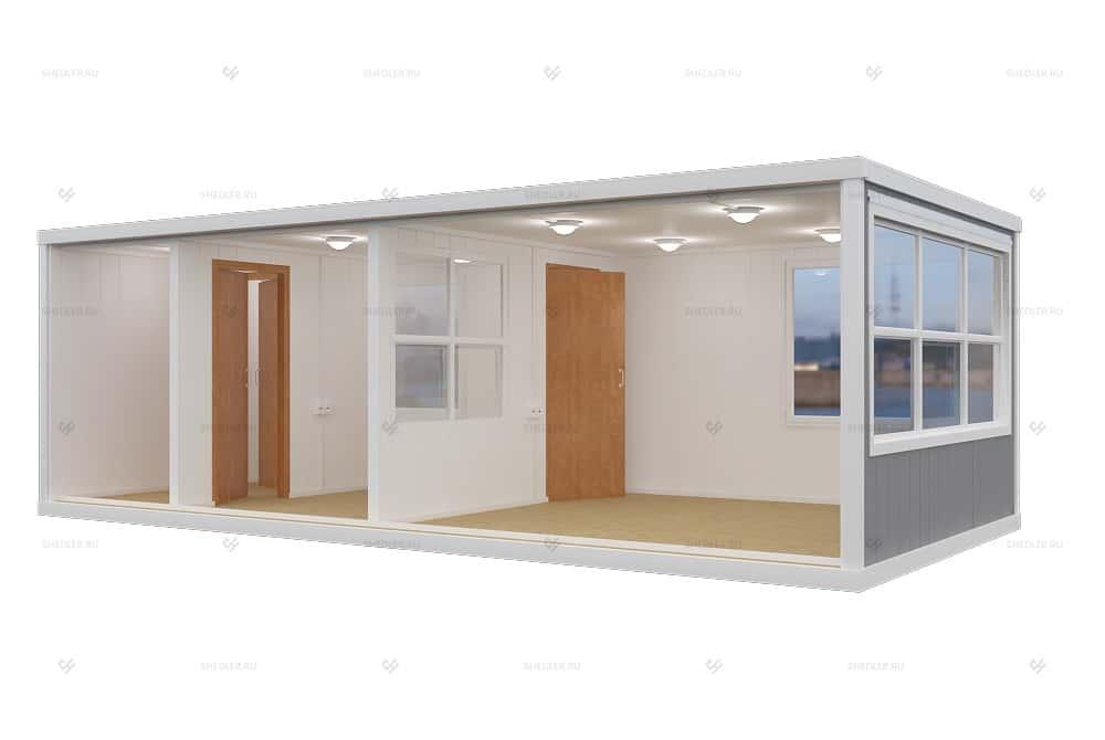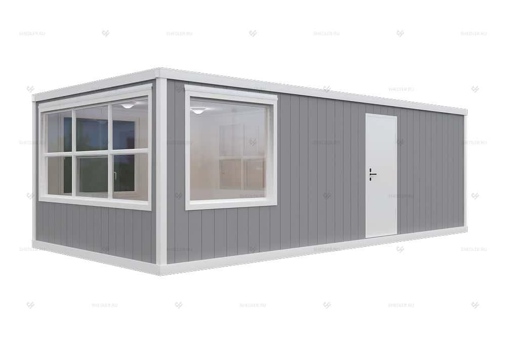 Модульное здание КПП SHEDLER БК-018 из трёх блок-контейнеров из сэндвич-панелей размером 7,35 на 3,6 м. Может быть установлено на территории производства, завода, парковки, жилого комплекса, строительной или торговой площадки. В здании сквозной проход с двумя дверями, отдельное помещение для охранника, а так же две небольшие комнаты, которые могут быть использованы под санузел.