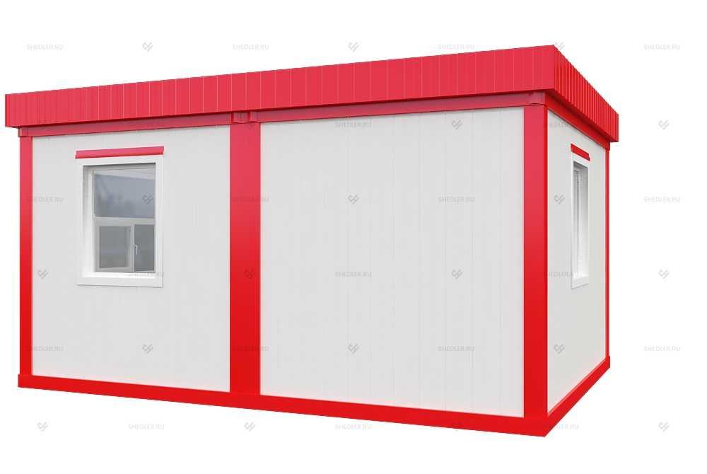 Двускатная кровля состоит из мауэрлата, стропил, конька, стоек, опор и других элементов. Стропильная система может быть двух видов – висячей и наслонной. В качестве кровельного материала может выступать профлист С8, который крепится специальным крепежом к обрешётке. Угол наклона может быть 10 или 12 градусов, в зависимости от ширины конструкции. Используется для модульных зданий различного назначения: офис, штаб строительства, общежитие и т.д.