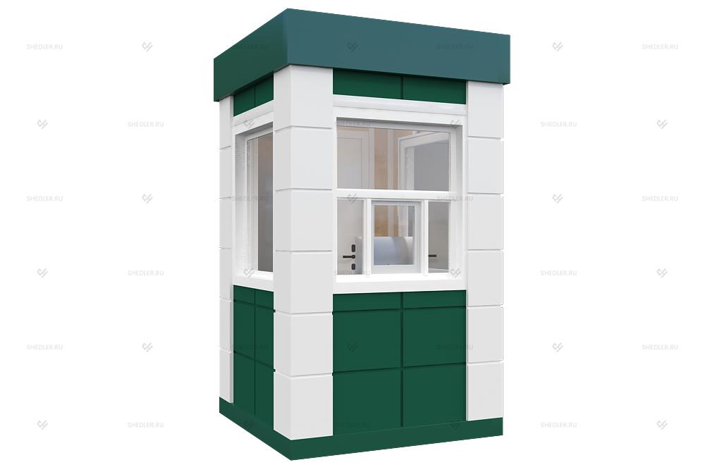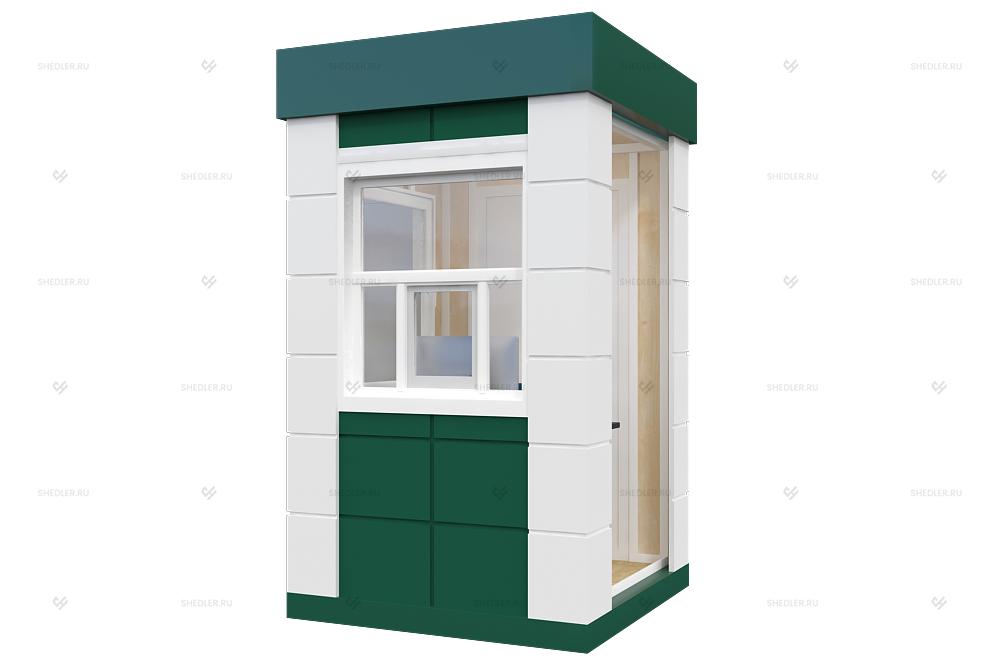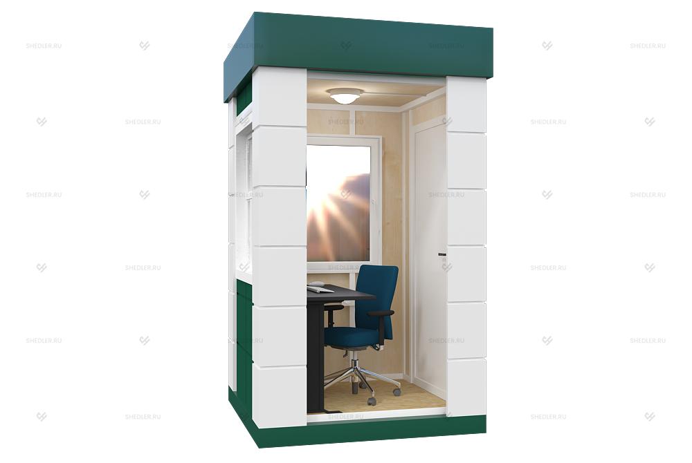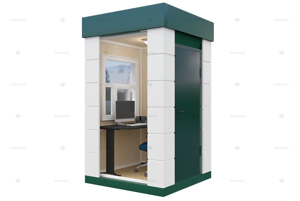 Блочно-модульный объект размером 1,5 x 1,5 x 2,45 м имеет площадь 2,25 кв.м. На входе установлена металлическая, утепленная входная дверь российского производства с врезным замком и необходимой фурнитурой. Панорамный обзор обеспечивают 3 ПВХ-окна. Одно из них размером 1,2 x 1,0 м в глухом исполнении с окошком для документов, остальные размером 0,8 x 1,0 м оснащены поворотно-откидным механизмом, обеспечивают проветривание в разных режимах.