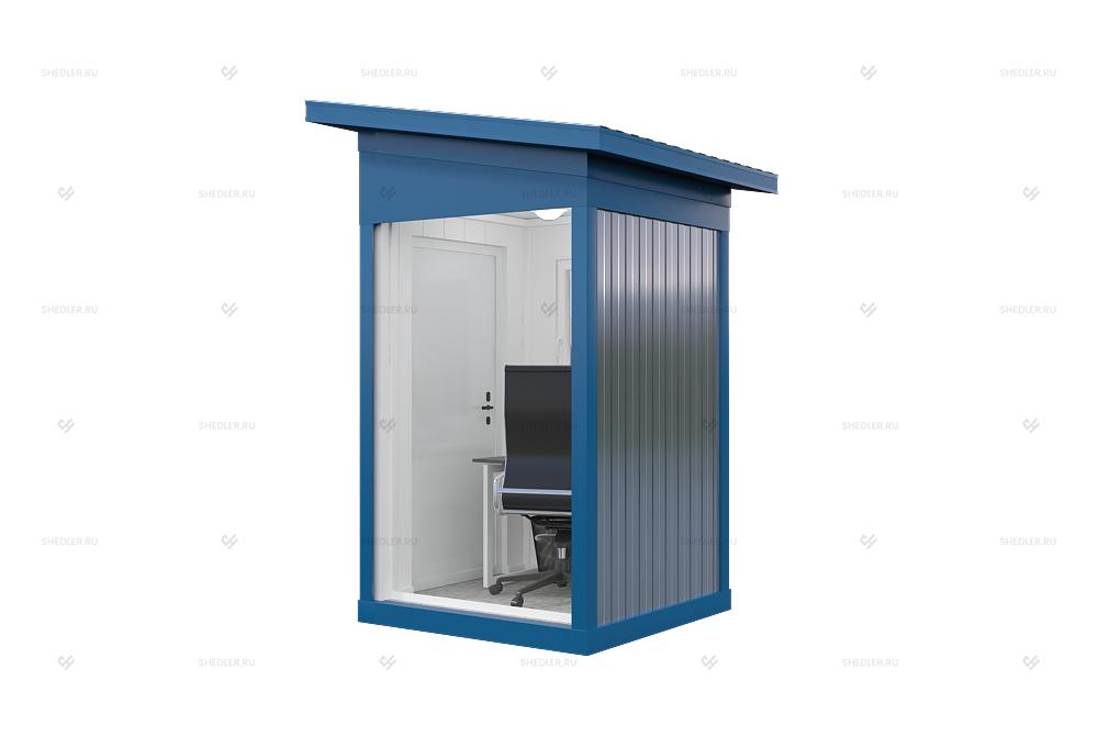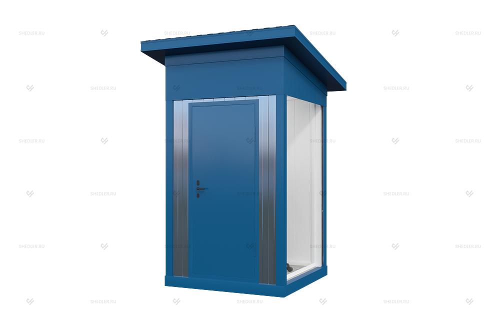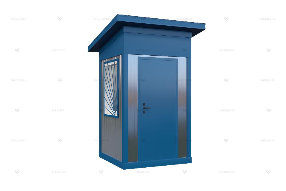 Пост охраны ПБК- 04 из блок-контейнера от SHEDLER в основном собран из металлопроката: каркас сварен из швеллера 120 мм и уголка 90 мм, покрыт порошковой краской синего цвета, фасад собран из оцинкованного профлиста.