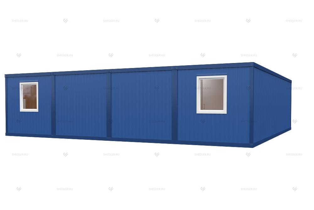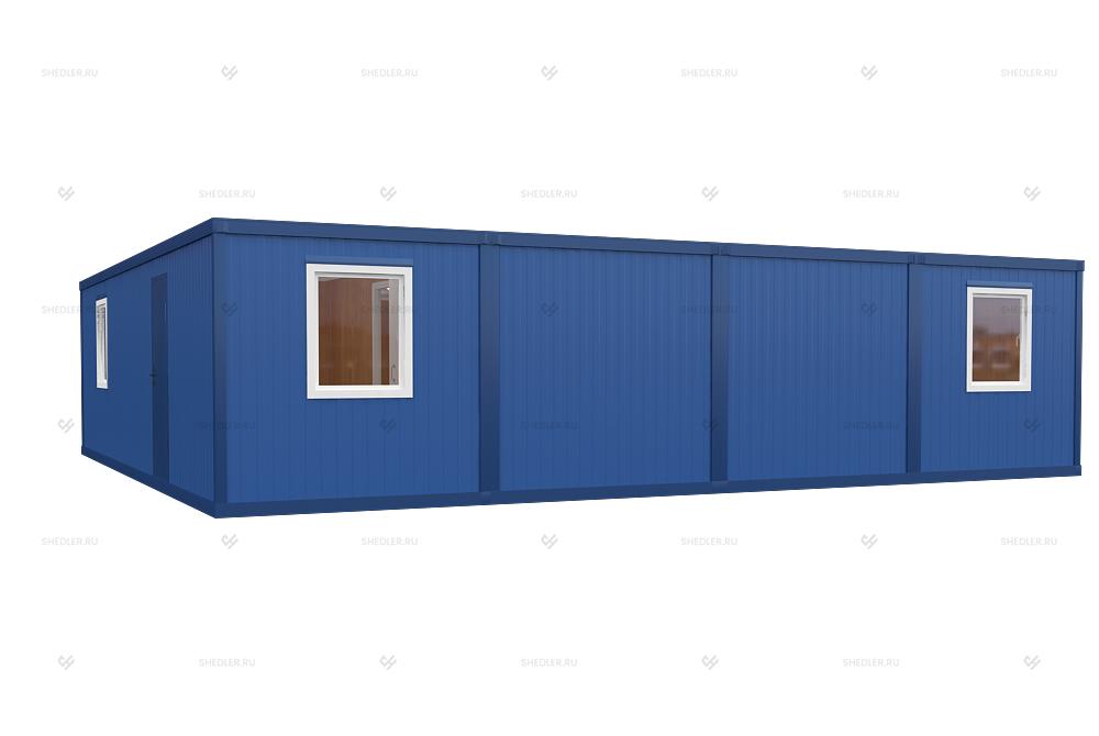Двускатная кровля состоит из мауэрлата, стропил, конька, стоек, опор и других элементов. Стропильная система может быть двух видов – висячей и наслонной. В качестве кровельного материала может выступать профлист С8, который крепится специальным крепежом к обрешётке. Угол наклона может быть 10 или 12 градусов, в зависимости от ширины конструкции. Используется для модульных зданий различного назначения: офис, штаб строительства, общежитие и т.д.