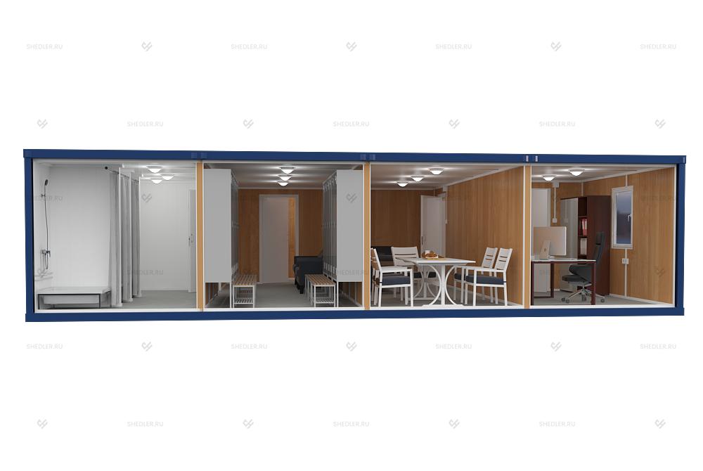 ПП-01 от SHEDLER предназначен для размещения людей, средств пожаротушения, контрольно-измерительного оборудования. Для этого внутреннее пространство разделено на несколько комнат, в том числе – душевую и туалет. На входе установлена металлическая дверь российского производства. Быстрое перемещение между помещениями обеспечивают 8 межкомнатных дверей из МДФ с необходимой фурнитурой (петли «бабочка» и ручки).