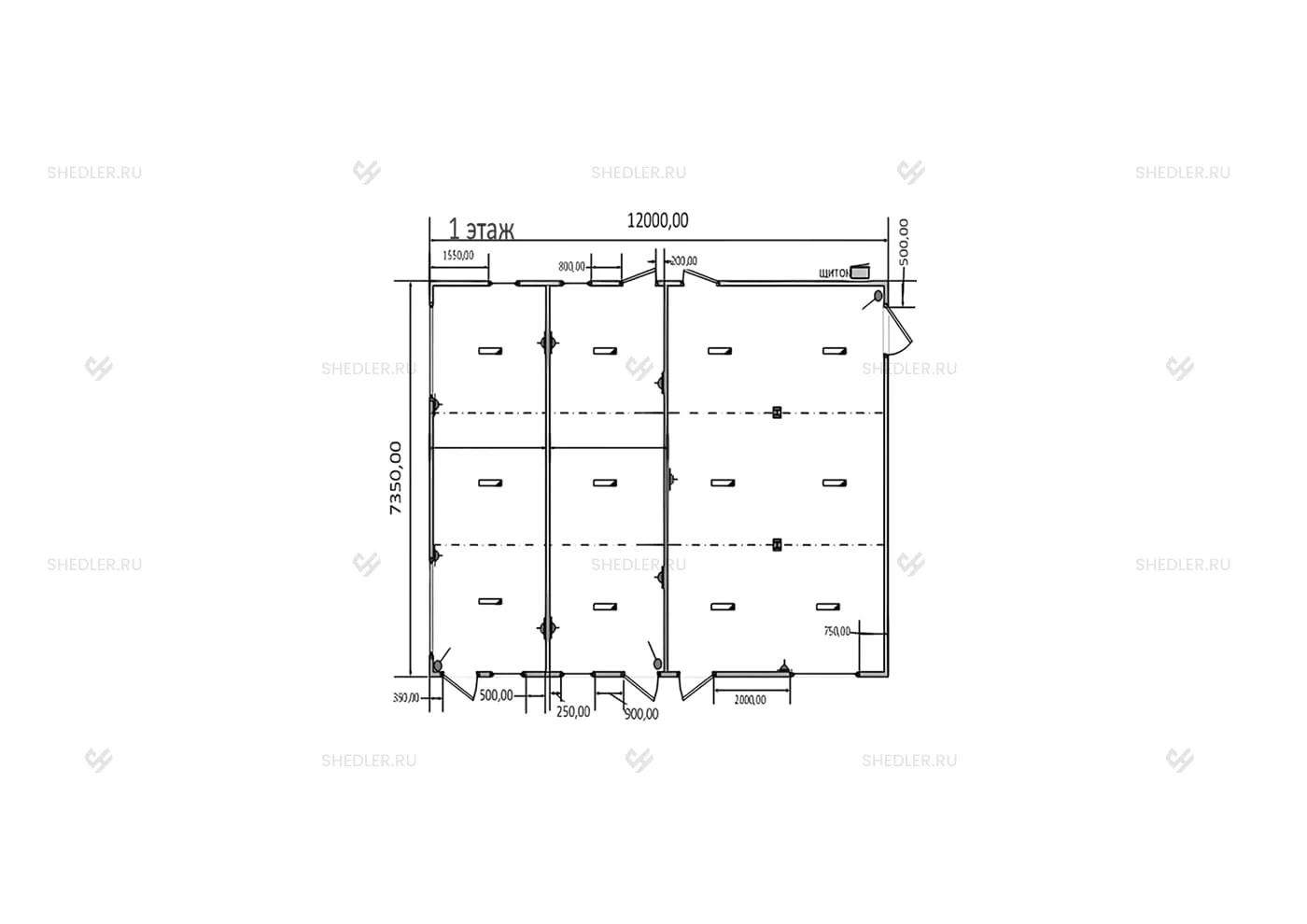 | Проем под входную дверь (7 шт.) | 0,8 x 2,1 м, с обрамлением из бруса 100 x 40 мм, с обработкой огнебиозащитным составом |