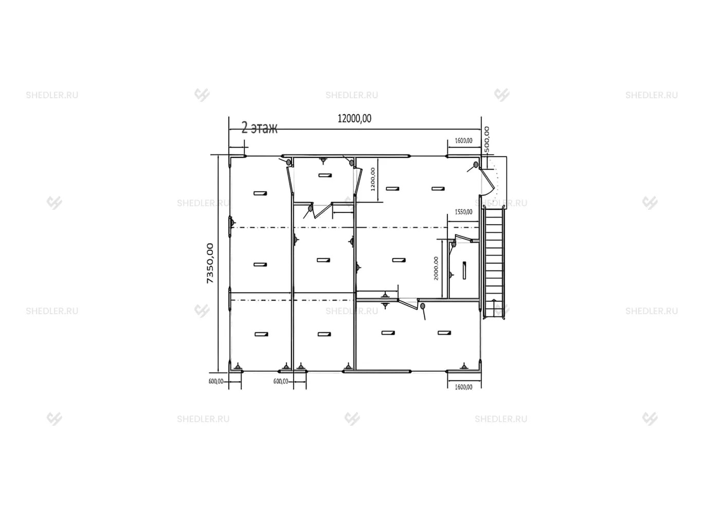 | Лестница (1 шт.) | На 2-й этаж, с площадкой 1,25 x 2,5 м и перилами |