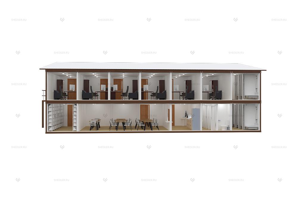 Модульное здание БМ-31 от Шедлер – это блочно-модульная конструкция, которое относится к промышленной категории с возможностью использования в качестве офиса или бизнес-центра. Этому способствует большая вместимость: двухэтажный объект из 36 блок-контейнеров имеет габариты 17,15 x 14,45 x 2,45 м и площадь 247 кв.м.