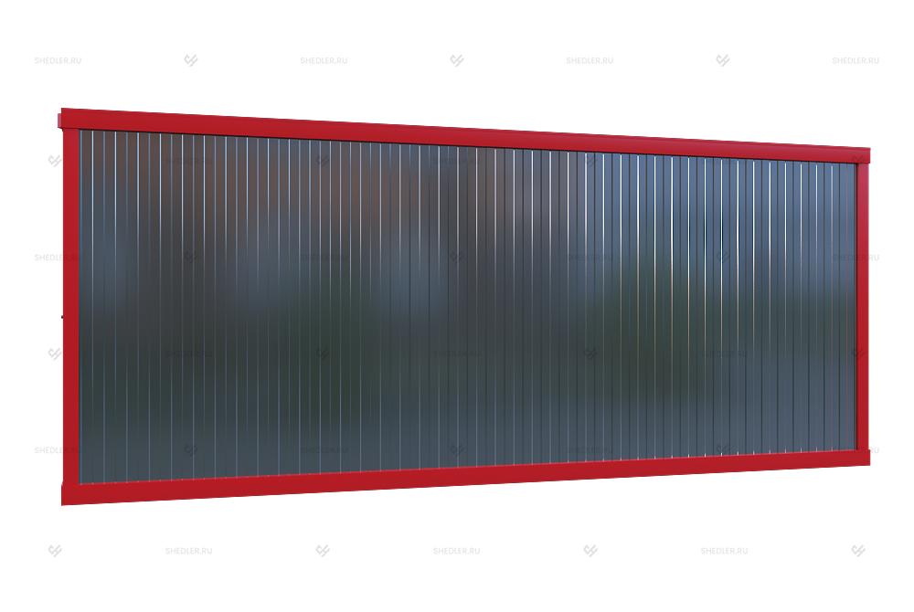 Сверху на несущую основу установлена плоская крыша из листового железа синего цвета, а снизу – дно из оцинкованного профлиста C8. Из профилированного листа с гальваническим покрытием собирается и фасад.