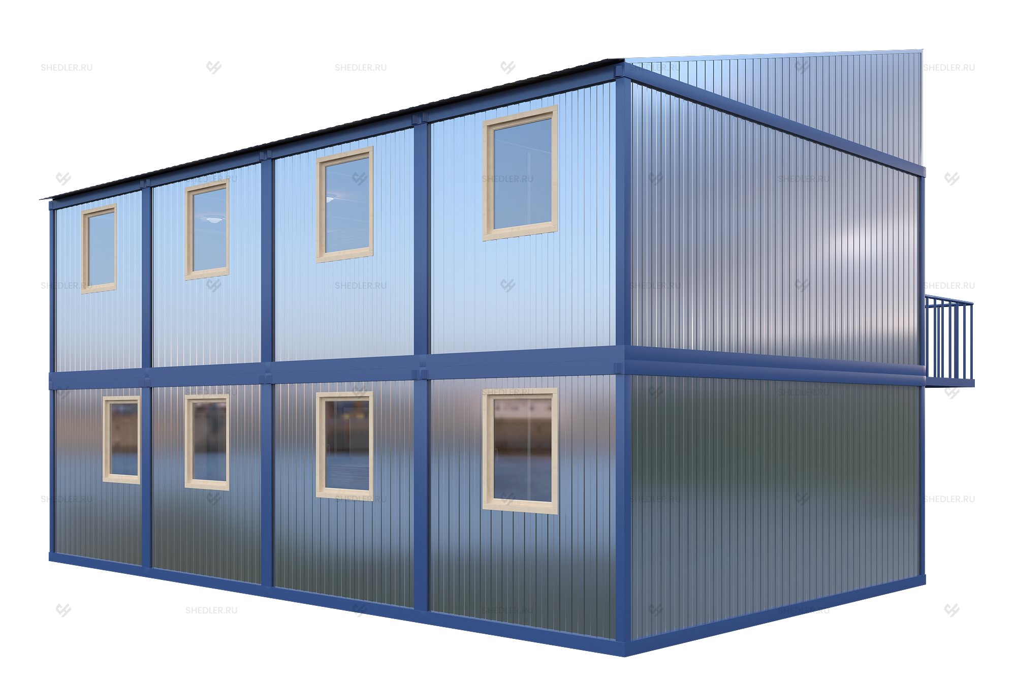 Каждый модуль представляет собой блок-контейнер, который изготавливается на основе крепкого сварного каркаса из металлического профиля. Внешние стены обшиты оцинкованным листом или сделаны из сендвич-панелей, внутренняя часть утеплена и отделана листами ДВП или сендвич-панелями. Модульные общежития могут быть окрашены по вашему заказу в любой цвет палитры RAL. Пол во всех блок-контейнерах SHEDLER выполнен из OSB, крыша плоская и изготовлена из листовой стали. Каждый модуль оснащен окнами в двух вариантах: деревянные с двойным остеклением или поворотно-откидные ПВХ. Внутри устанавливается душ, туалет, электропроводка для максимально комфортного проживания.