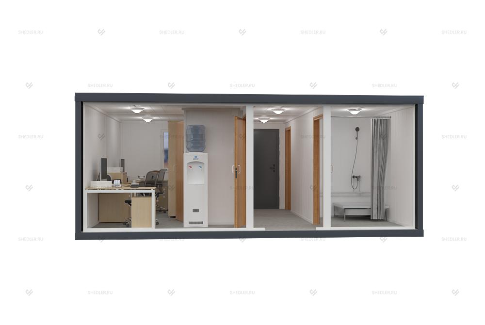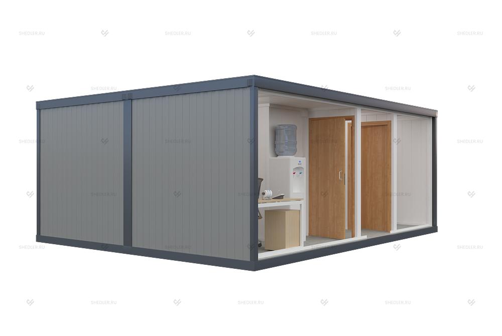 Одноэтажное модульное здание от компании Шедлер размером 5,85м х 4,9м х 2,45м – это доступная и удобная альтернатива капитальному сооружению. Объект собирается как конструктор из 2 блок-контейнеров. Внутреннее пространство разделено на несколько изолированных помещений, блочно-модульная конструкция подключается к инженерным коммуникациям – владелец объекта ничем не ограничен.