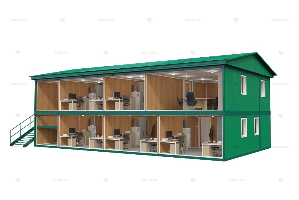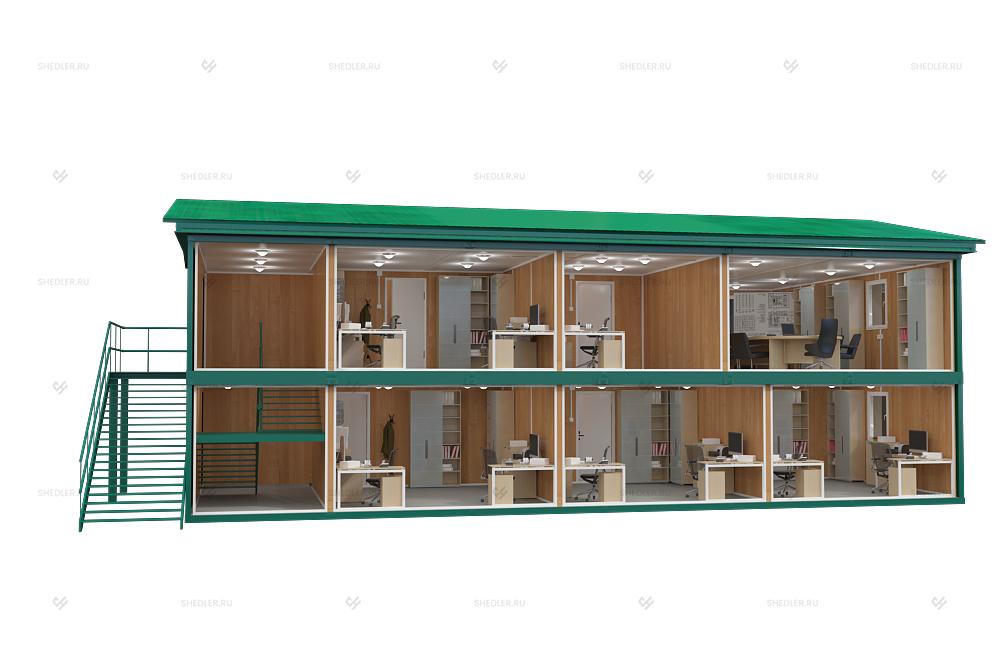 Модульное здание МД-38 SHEDLER полностью готово к использованию, его собирают на заводе и привозят укомплектованным – заходи и живи. Несмотря на большие размеры, конструкция доставляется собранной с помощью специальной техники. Для монтажа не нужен фундамент, подойдет любая основа. Здание можно установить на блоки или сваи. Стоит отметить, что быстровозводимые конструкции не считаются капитальными, даже если они больших размеров, а это упрощает размещение, не нужно запрашивать и получать разрешение на установку.