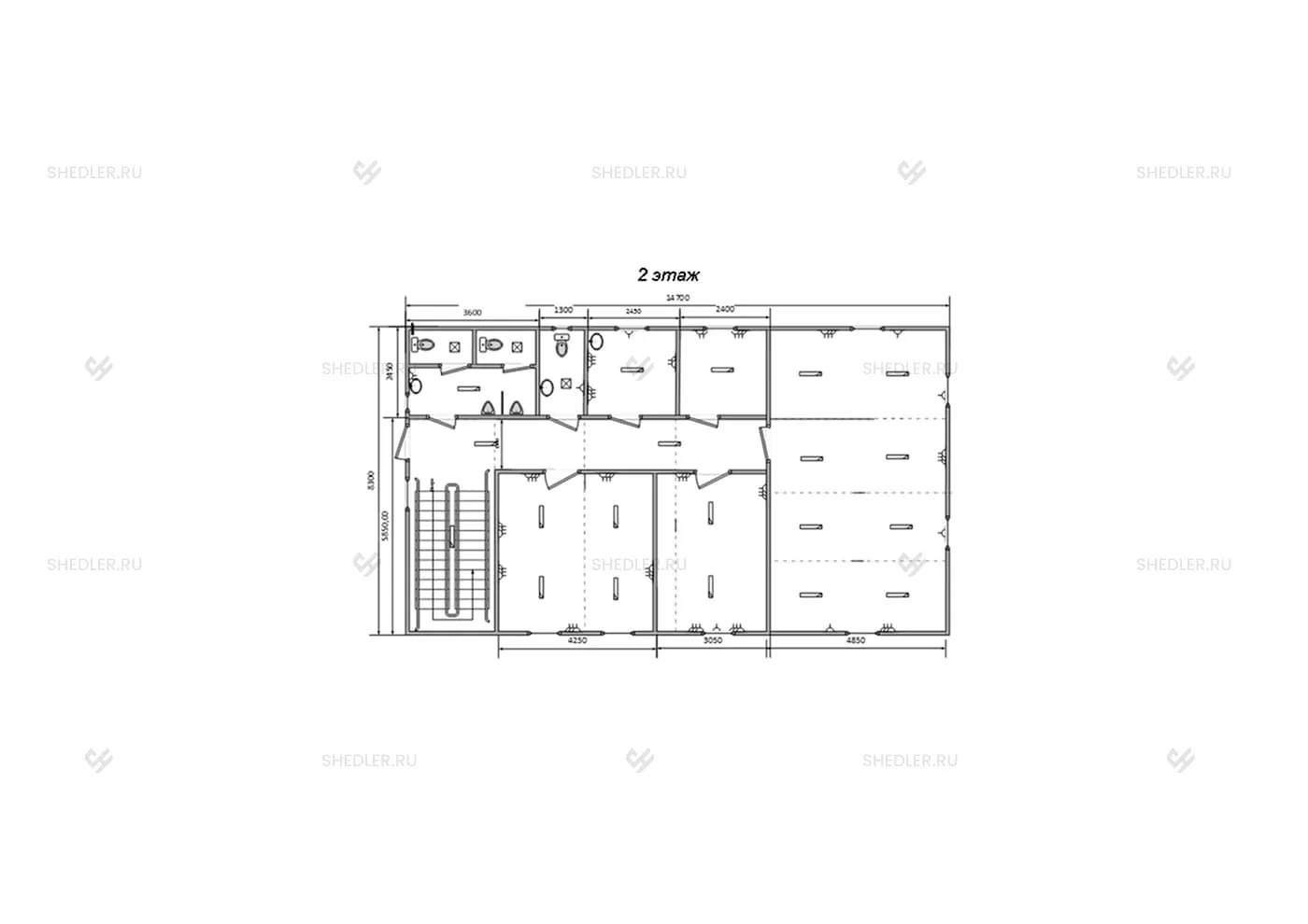 При габаритах 14,7 x 8,3 x 4,9 м общая площадь составляет 244,02 кв.м. Организованный поток людей обеспечивает 2 входа с металлическими утепленными дверями, а также поворотно-разворотная лестница с площадкой и перилами из профтрубы.