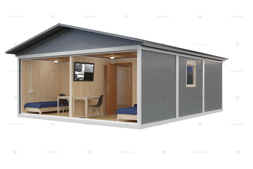 Одноэтажное модульное здание МЗ-16 от компании Шедлер с габаритами 5,85м x 7,35м x 2,45м собрано из 4 блок-контейнеров, чаще всего используется в качестве легковозводимого промышленного объекта.