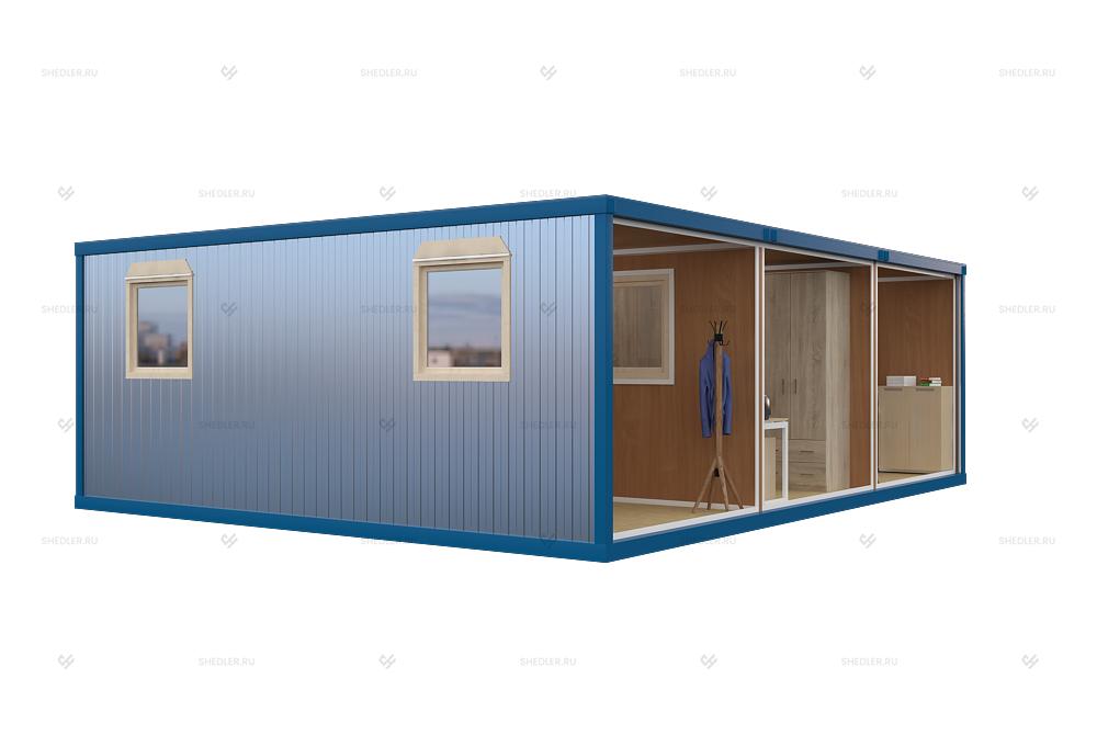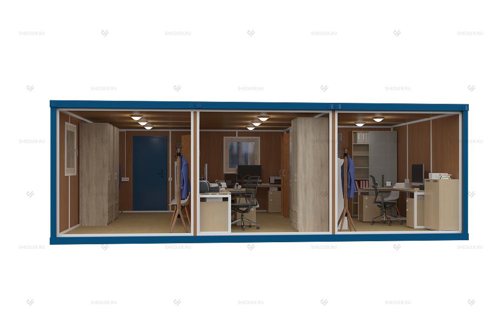 Модульное здание МЗ-21 от компании Шедлер - это одноэтажное модульное здание из 3 блок-контейнеров с плоской крышей. Благодаря габаритам 7,35м x 5,85м x 2,45м легко установится даже на ограниченном пространстве. Используется в качестве мобильного офиса в удаленных локациях: в вахтовых поселках, небольших населенных пунктах. Обеспечивает высокую экономическую эффективность в любой локации.