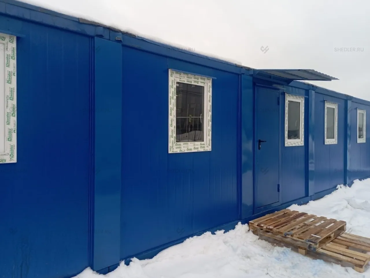 Конструкция в любое время может быть разобрана и перевезена на другой объект. Срок эксплуатации не ограничен, может колебаться до 50 лет. В зависимости от цели назначения, размер и количество окон может быть любым. В стандартном варианте устанавливается 9 ПВХ окон 0,8 м на 1,0 м. Металлические двери также утеплены, отделаны дермантином внутри и металлом снаружи.