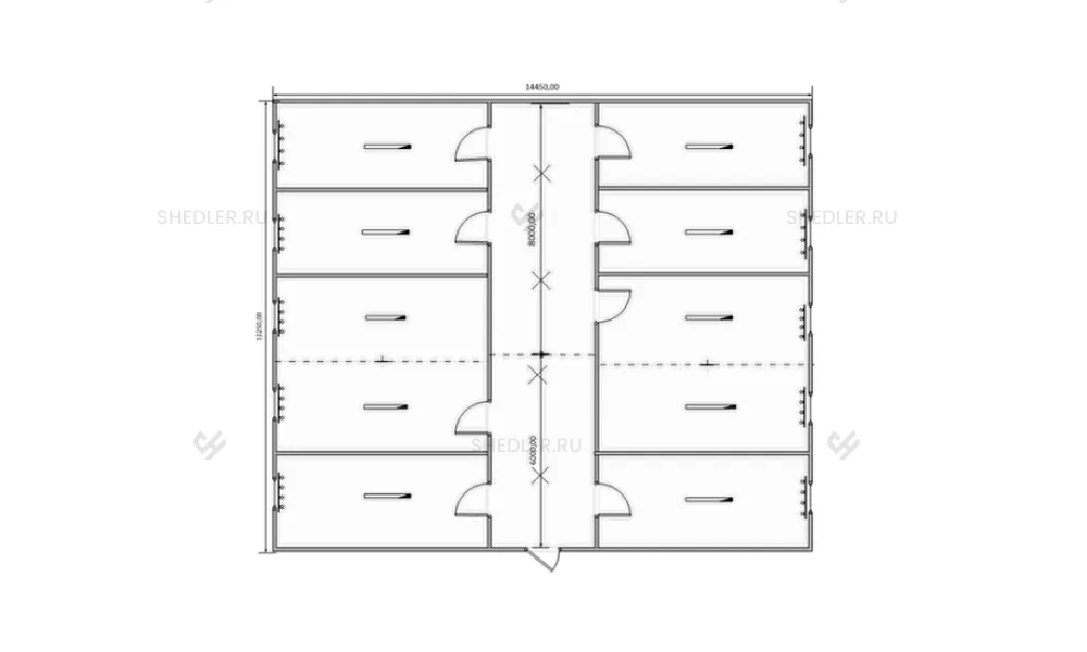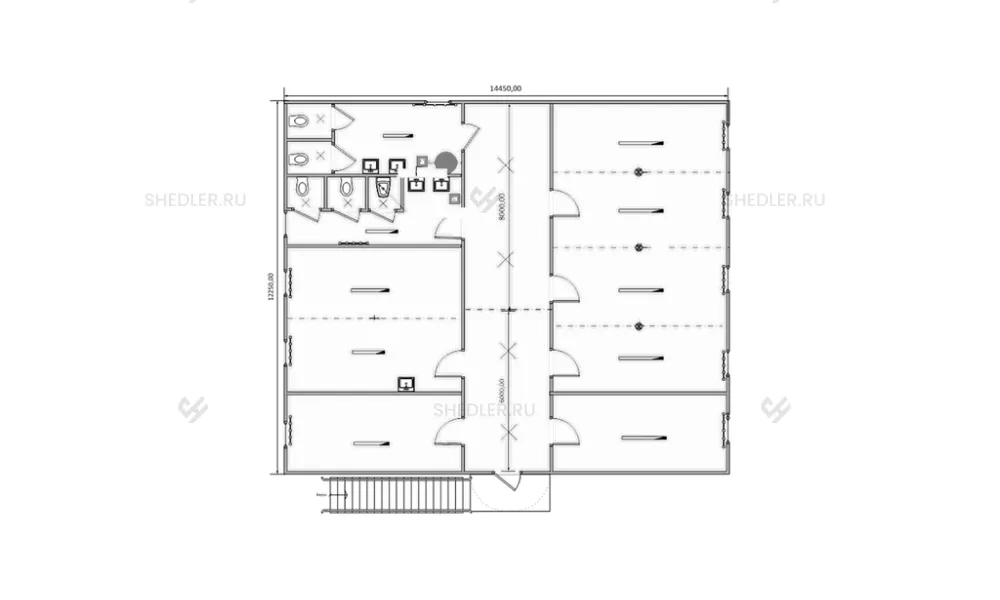 Для перемещения между этажами есть наружная лестница с площадкой, а также 2 утепленные металлические двери российского производства, окрашенные в RAL 6003. На каждом этаже 5 перегородками с дверью отделены санузлы, в проекте также предусмотрена столовая и другие помещения. Санузлы оснащены полным комплектом сантехники – унитазы, биде раковины. Горячее водоснабжение обеспечивает бойлер, а комфортную температуру воздуха – предустановленные конвекторы, а также утепление пола, стен и потолка базальтовой ватой УРСА 100 мм.