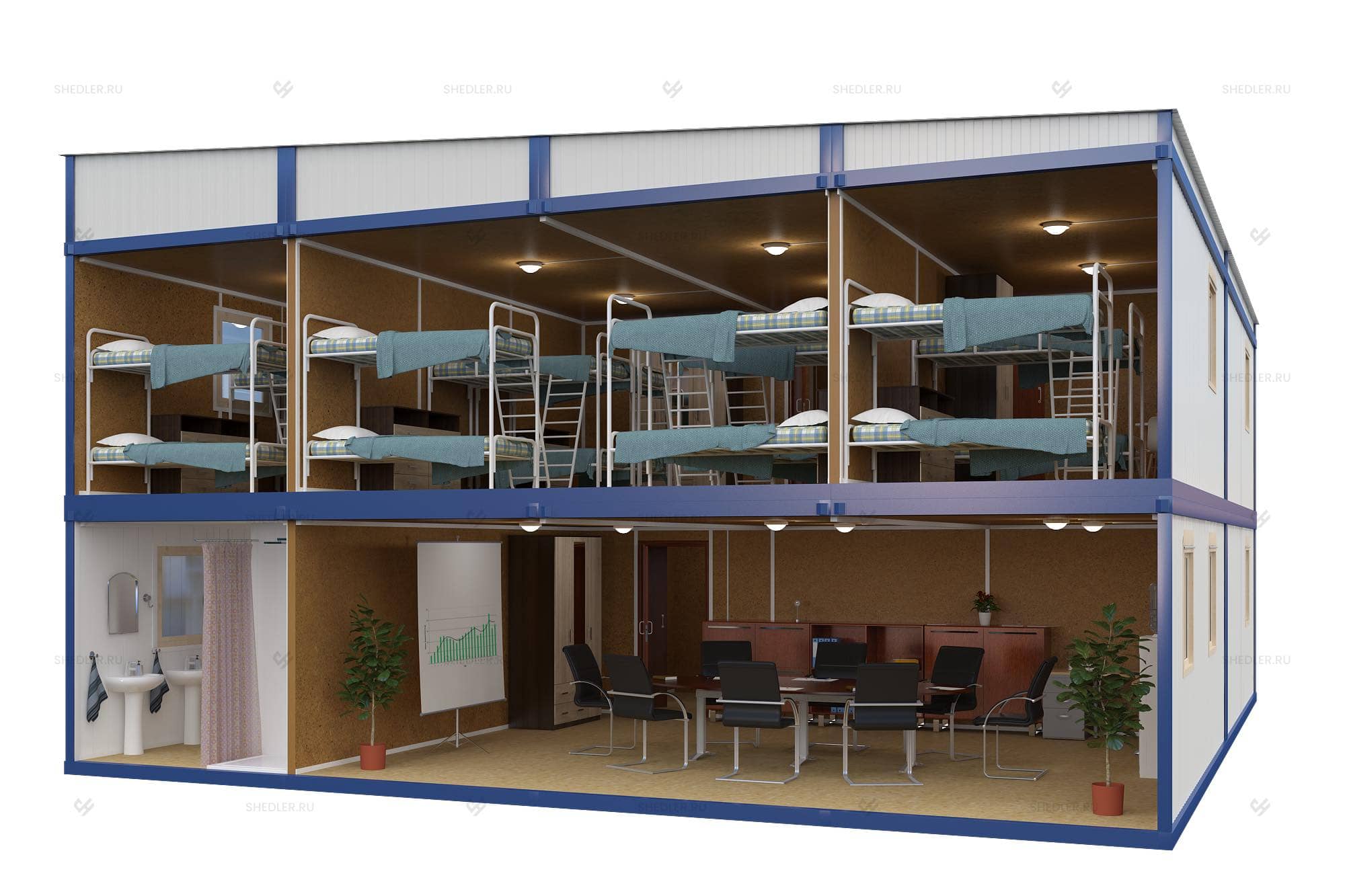 Компания SHEDLER готова выполнить на заказ проект любой сложности. Достаточно выбрать планировку и указать количество модулей. Преимущество таких конструкций – в их удобстве: в любой момент их можно переместить на другое место, быстро продать или адаптировать под другие задачи.
